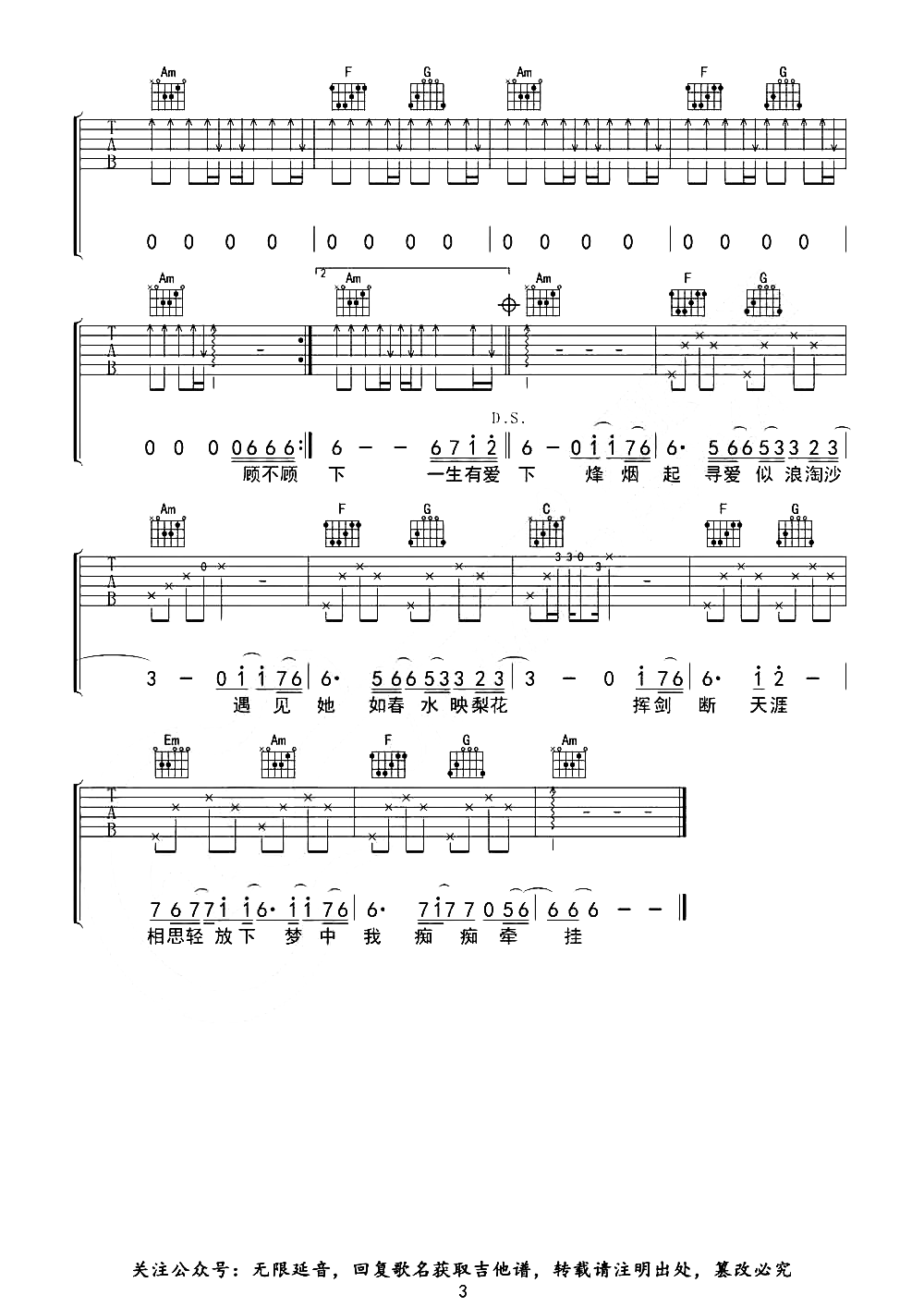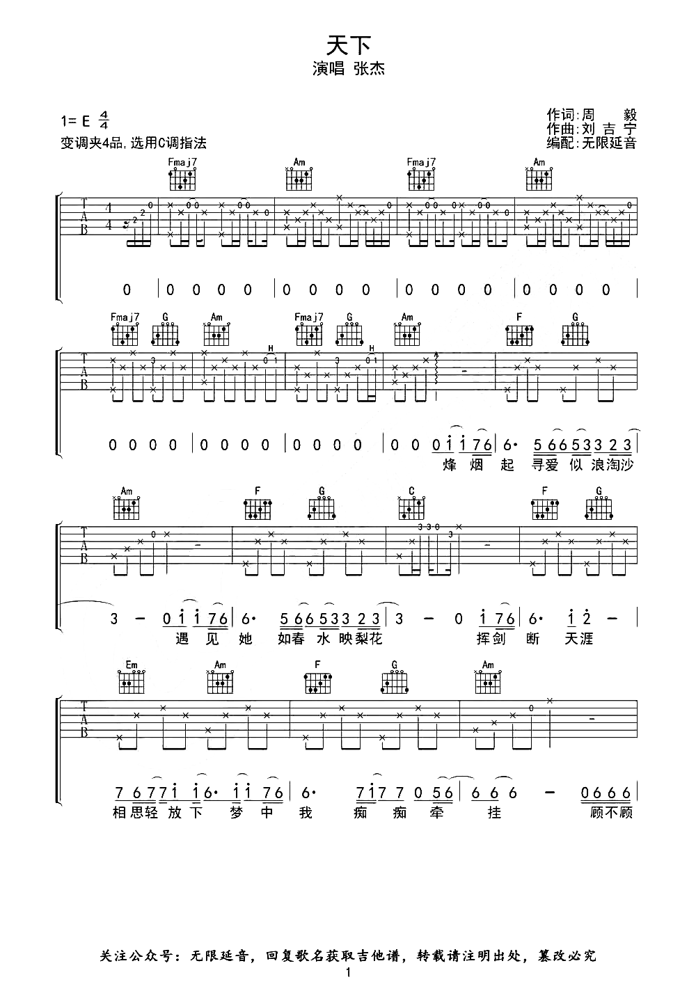 曲谱介绍:   《天下》气魄的编曲透出了侠骨柔情的感受,传统古风和流行音乐的完美碰撞如画龙点睛般的存在,江山仍在,但心系没人,张杰用别样的“天下”诠释着英豪儿女中的故事,丰富的情感蕴藏着压抑、柔情、暴烈和坚毅。 张杰《天下》吉他谱,共3张高清PNG图片谱,选用C调指法编配,原调E调,CAPO夹4品弹唱原调,含前奏超还原版,随谱附《天下》吉他弹唱演示,可供参考。