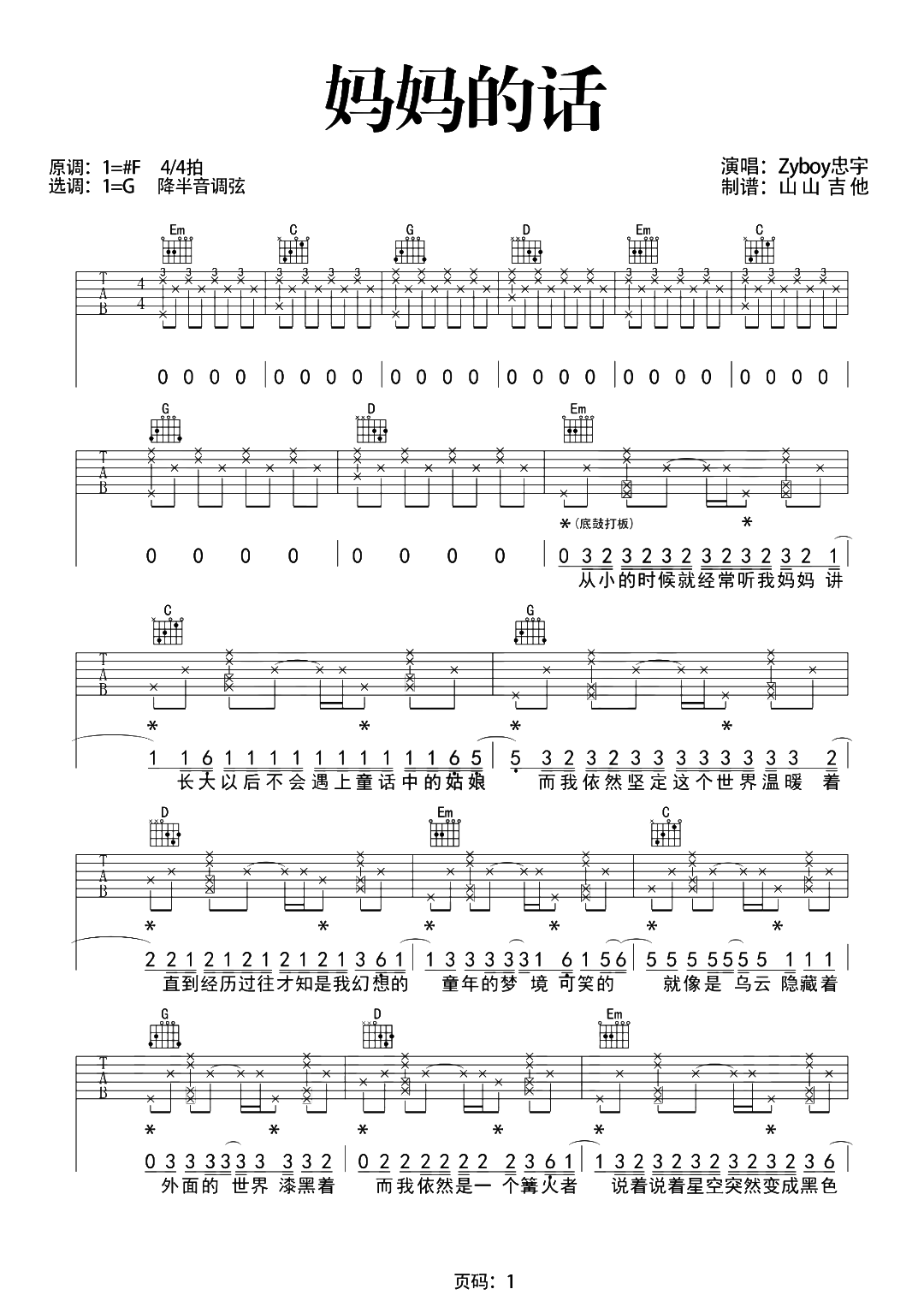 妈妈的话吉他谱 - zyboy忠宇 - G调吉他弹唱谱 - 原版