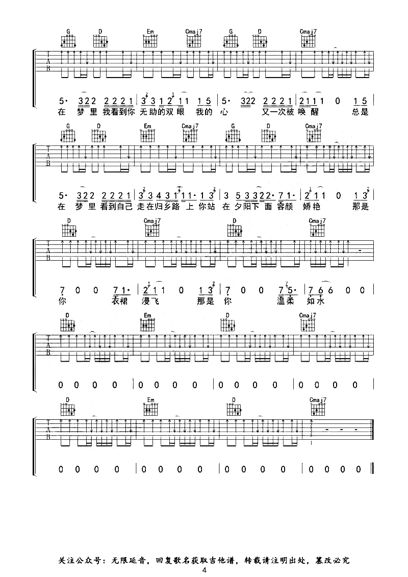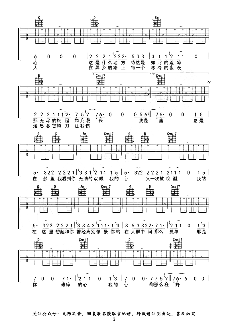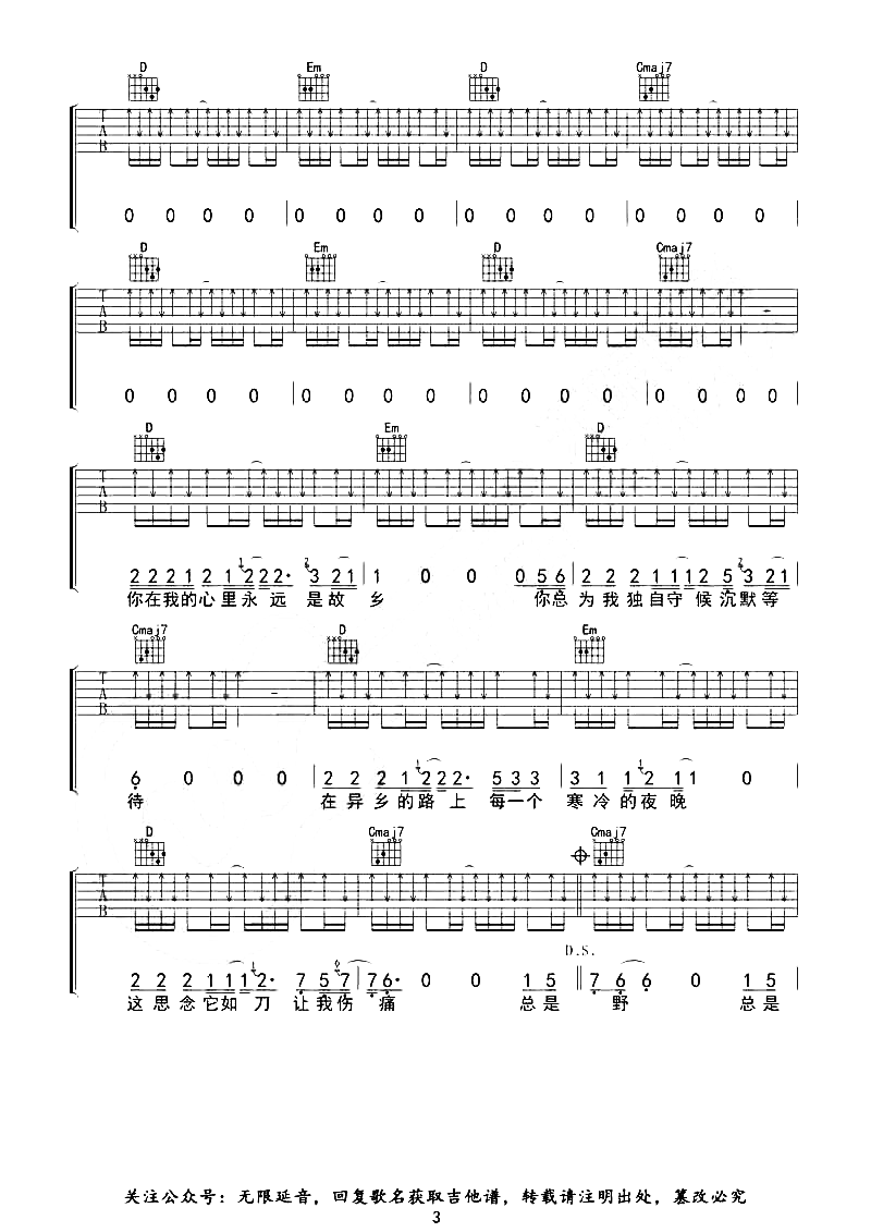 曲谱介绍:   许巍《故乡》,看似心怀故乡的创作,却是关于妻子的故事,北漂之时背井离乡,与妻子从此分隔两地,总能让他在无数个夜里牵绊,想起分别时的场景,想起无数个在一起的画面,其实“故乡”就是关于她的一切。 许巍《故乡》吉他谱,无限延音制谱,选用G调指法,原调bB,CAPO夹3品弹唱原调,随谱附《故乡》吉他弹唱演示,本谱难度:2/5,还原度:80%。