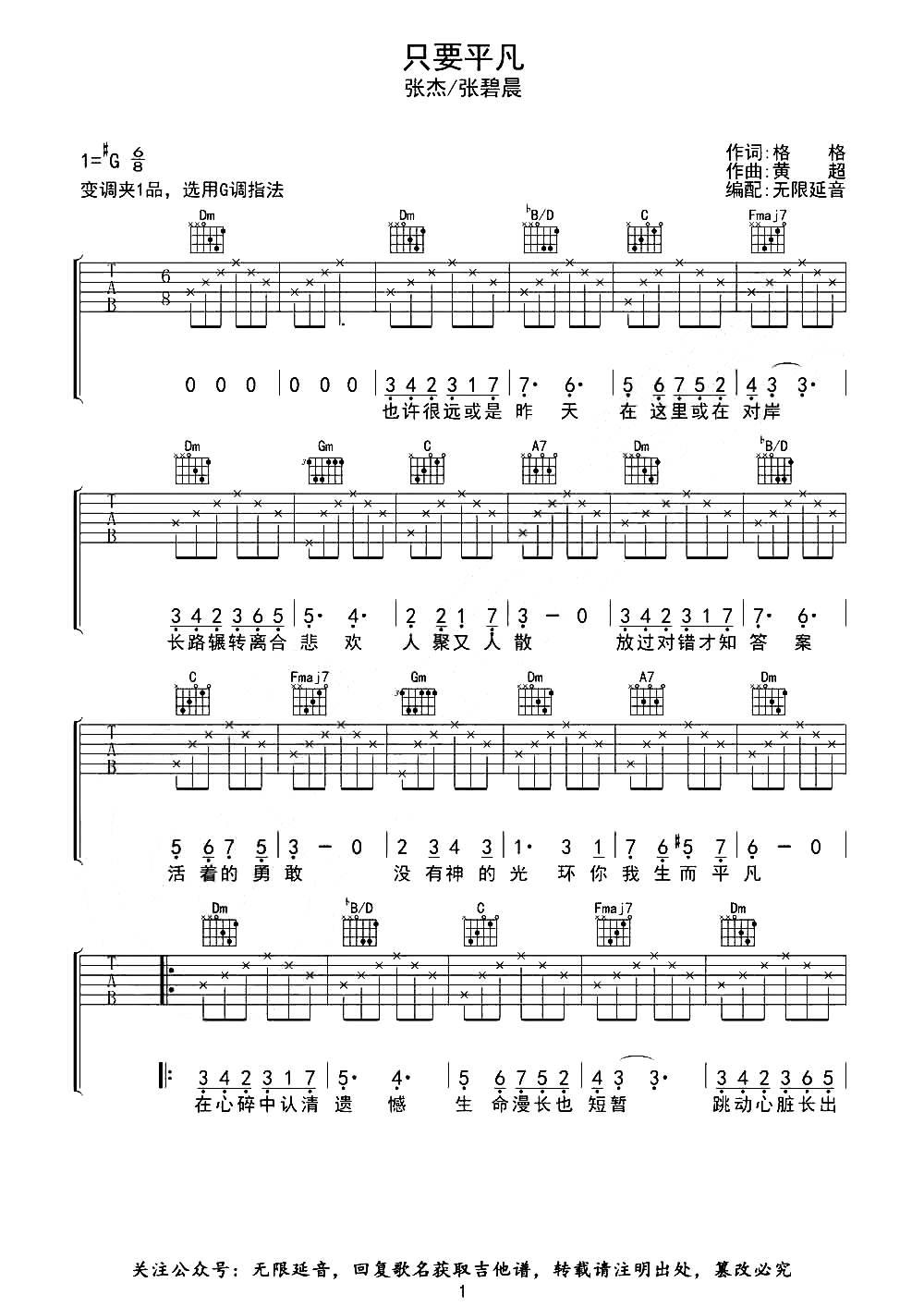 曲谱介绍:   《只要平凡》由张碧晨/张杰演唱的《我不是药神》电影主题曲,旋律安静中带着丝丝悲凉,感觉透出了不少关于人生的感叹,我们总在奔波中折腾,想要得到成功的答案,但是终究发现,归属于我们的还是“只要平凡”。 张杰/张碧晨《只要平凡》吉他谱,共3张高清PNG图片谱,选用G调指法,原调#G,节奏6/8拍,CAPO夹1品弹回原调,随谱附《只要平凡》的部分弹唱示范片段。