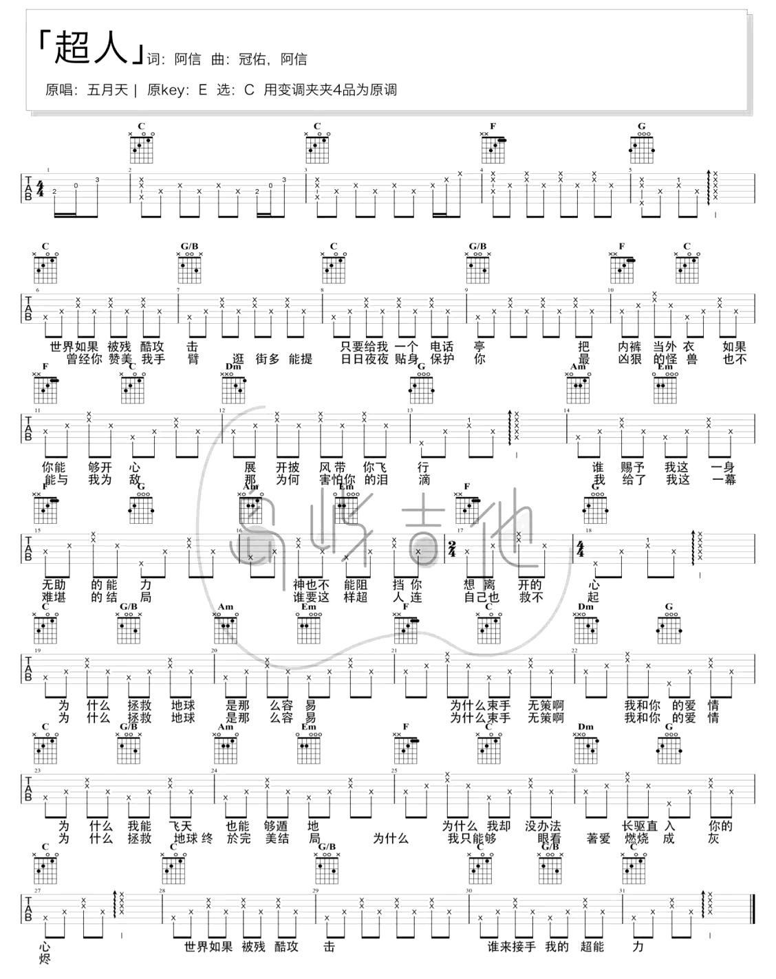 曲谱介绍: 《超人》吉他弹唱教学 《超人》是五月天演唱的歌曲,曲调温柔平缓述说着我们内心最真挚的遗憾,这首歌以第一视角将自己化身为“超人”,但却无法拯救自己的感情,投射到生活之中,同样很多人心的事情不是我们很强大就一定可以解决,我们只能从一开始就懂得珍惜,并让彼此双向奔赴。 超人吉他谱,由岛屿吉他制谱,选用C调指法,原调E调,CAPO夹4品弹回原调,随谱附《超人》吉他演示+教学视频,可供大家参考,本谱弹唱难度1/5,比较适合新手弹唱。