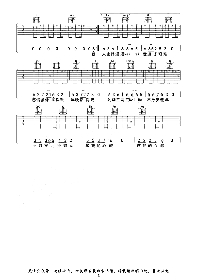 曲谱介绍:   《三两三》吉他谱链接:     三两三吉他谱,凌丰演唱的歌曲,人生总有道不尽的心酸,每逢夜晚总会在酌酒之中,体会着生活给人内心的忐忑,酌酒“三两三”,让我们振作精神,迈向重新开始的明天。 《三两三》吉他六线谱,选用C调指法,原调bG,CAPO夹6品弹唱原调,共三张图片谱例,扫弦节奏按原版编配,难度1/5。