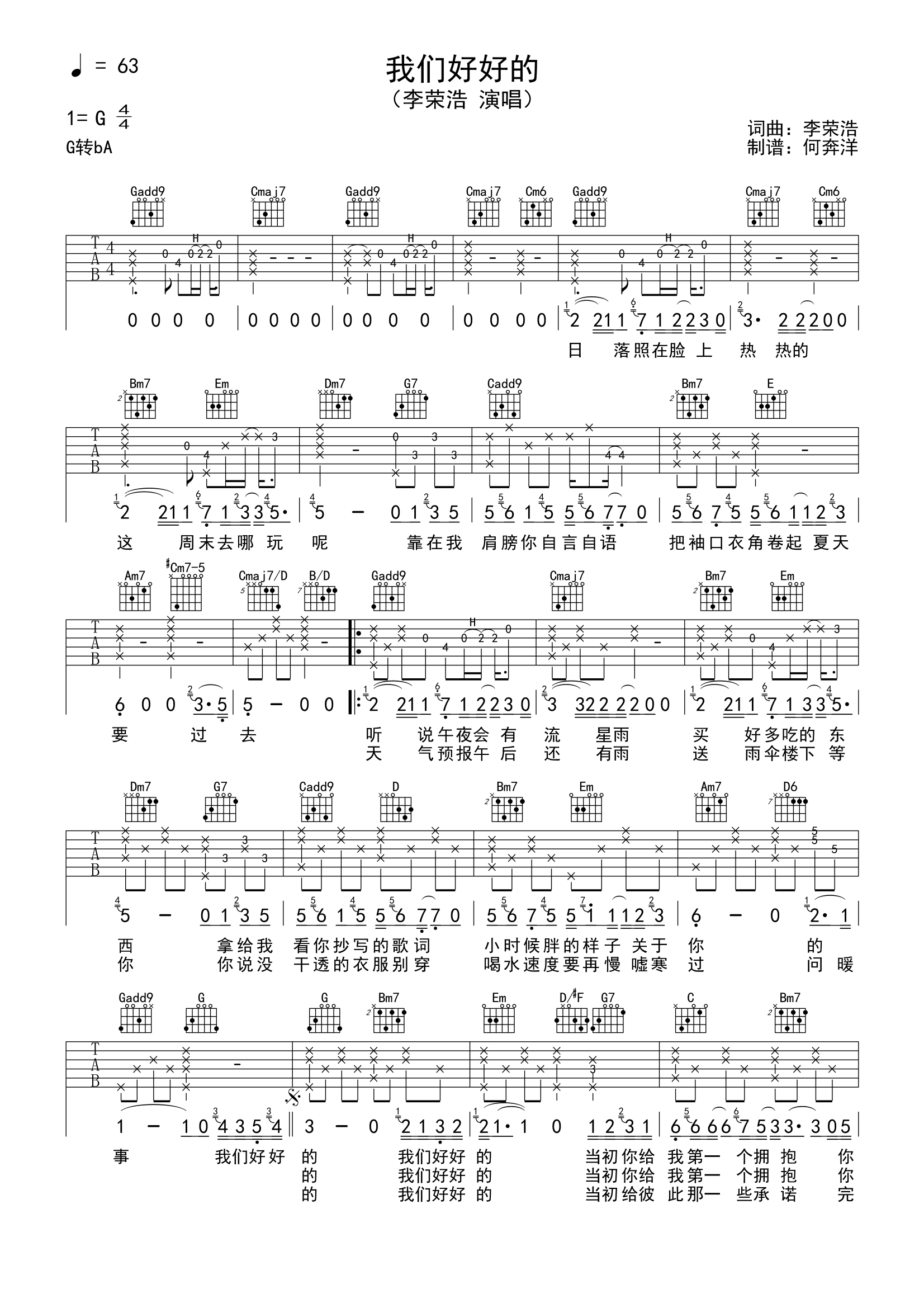 曲谱介绍:   李荣浩《我们好好的》吉他谱分享,一首温柔舒缓的情歌。 《我们好好的》吉他弹唱谱,共2张高清图片谱例,选用G调指法,原调G转bA,可不用变调夹弹唱,速度63BPM,节奏4/4拍,本谱按原版精细编配,难度:2/5,还原度:85%。