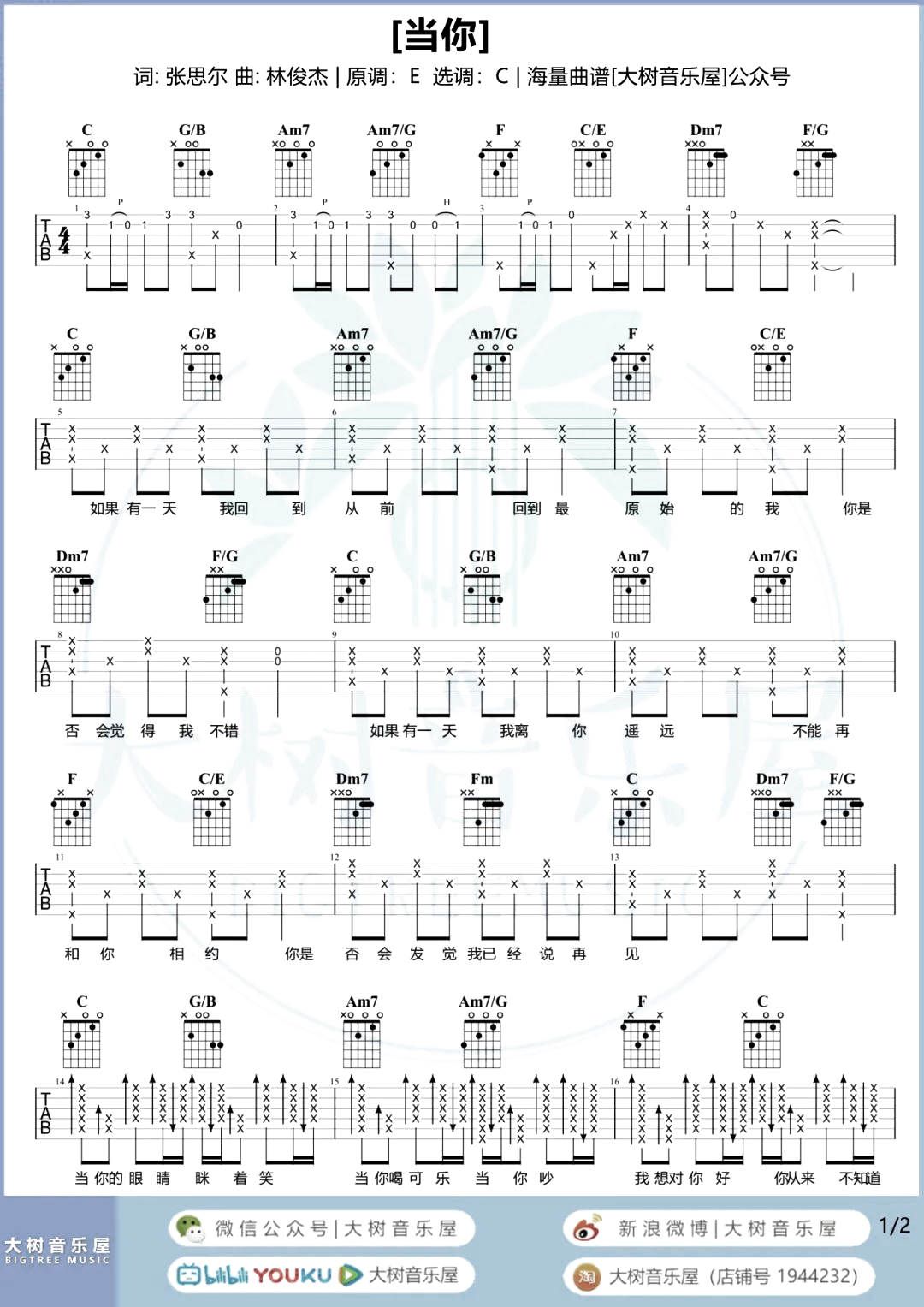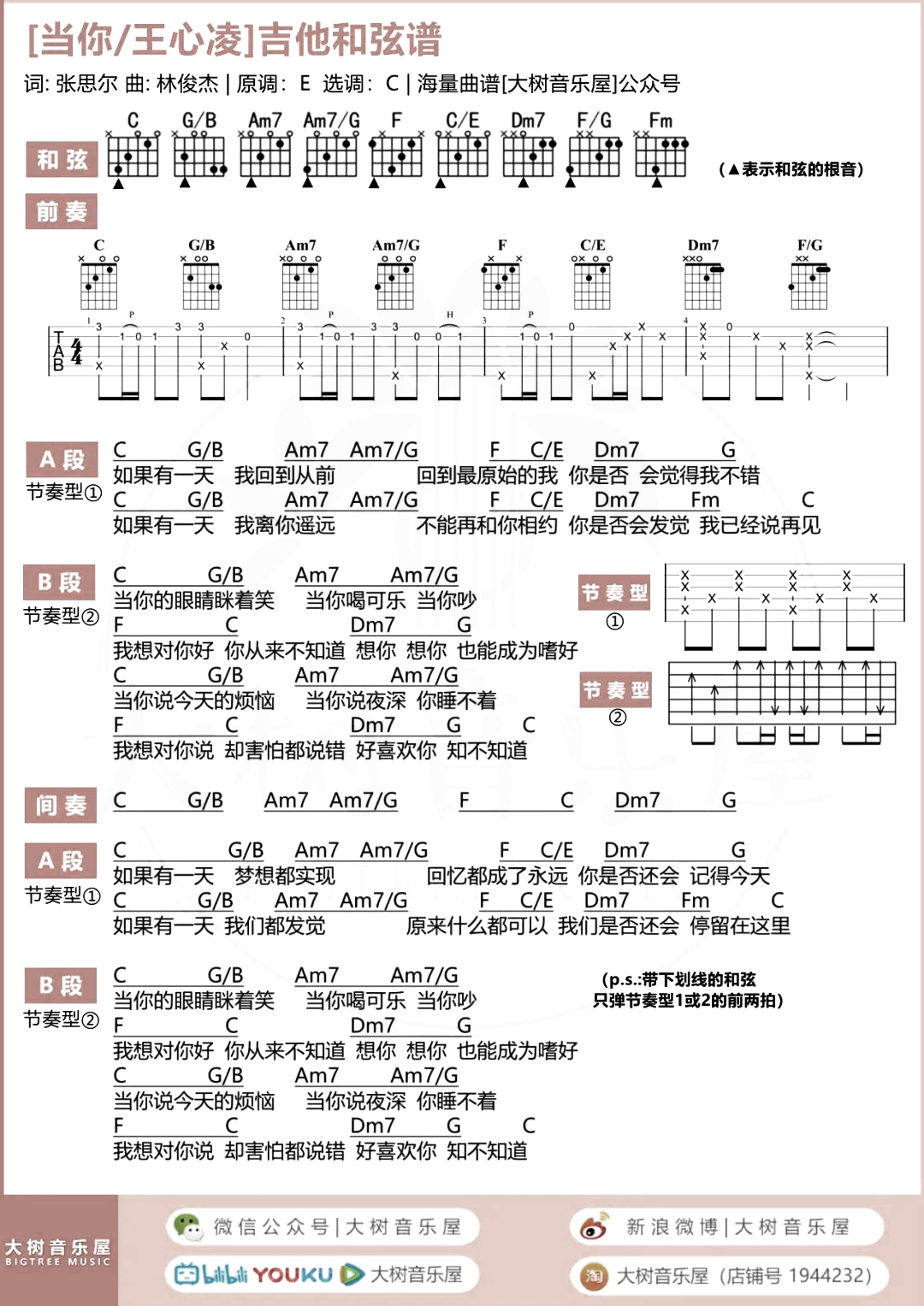 曲谱介绍: 《当你》吉他弹唱教学 其他版本的《当你》吉他谱参考:     当你吉他谱,王心凌演唱的回忆情歌,慵懒的嗓音,带着甜甜的小清新,但故事背后确实失去爱情后的委屈与悲伤,歌曲描述了一个女生失去感情后的怀念,副歌部分用重叠的“当你”,来表述自己对彼此感情中种种画面的怀念。 《当你》吉他弹唱谱,选用C调指法,原调E调,超还原版编配,女生弹唱原调,建议CAPO夹4品,本谱共2张六线谱+1张和弦谱,随谱附《当你》吉他弹唱演示+教学视频。 《当你》吉他六线谱: