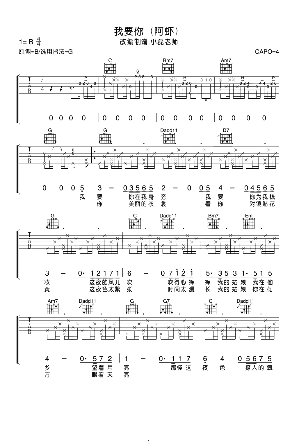 曲谱介绍: 《我要你》的其他曲谱版本链接:     我要你吉他谱,阿虾翻唱的歌曲,简单的弦乐,婉转而治愈,作为《驴得水》的主题曲,没有剧中的那般演绎浮夸,歌曲显得更加的平静淡然,更多的诠释中深深想念心中的“姑娘”,怡然而恬静。 《我要你》吉他弹唱谱,选用G调指法,原调B调,男生版弹唱推荐夹4品,本谱按阿虾版原版编配,除了前奏/间奏/尾奏,还加入了拍弦的技巧,也许是不错的吉他演绎版选择,大家可参考《我要你》吉他弹唱演示+教学视频,结合练习。