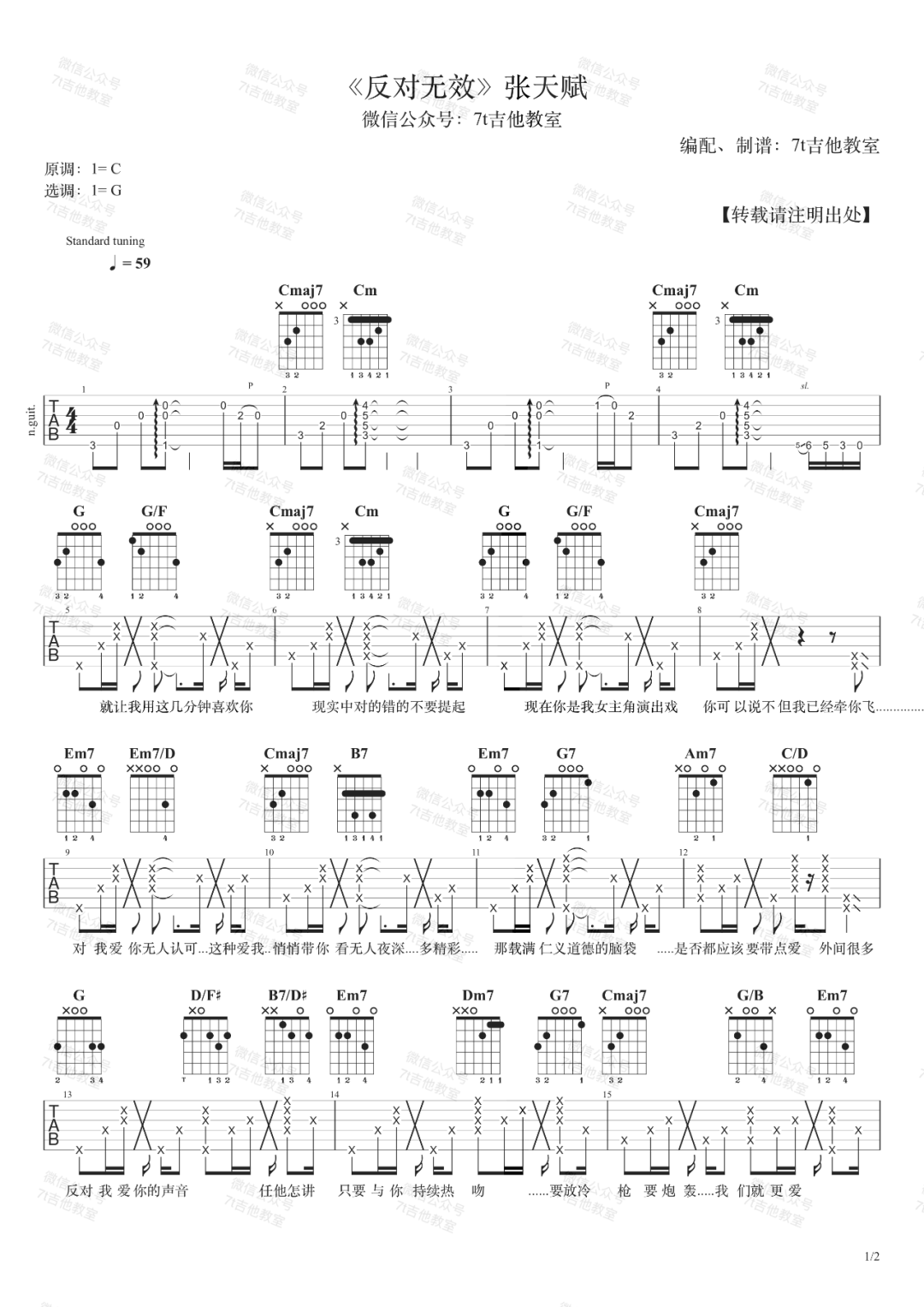 曲谱介绍: 张天赋《反对无效》,非常好听的粤语抒情歌曲。 张天赋《反对无效》吉他谱,由7T吉他教室制谱编配,选用G调指法,原调C调,弹原调需要夹6品,速度59拍每分钟,节奏4/4拍,随谱的《反对无效》吉他演示视频,是选用的bA调进行弹唱演示,还原度:85%,难度3/5。