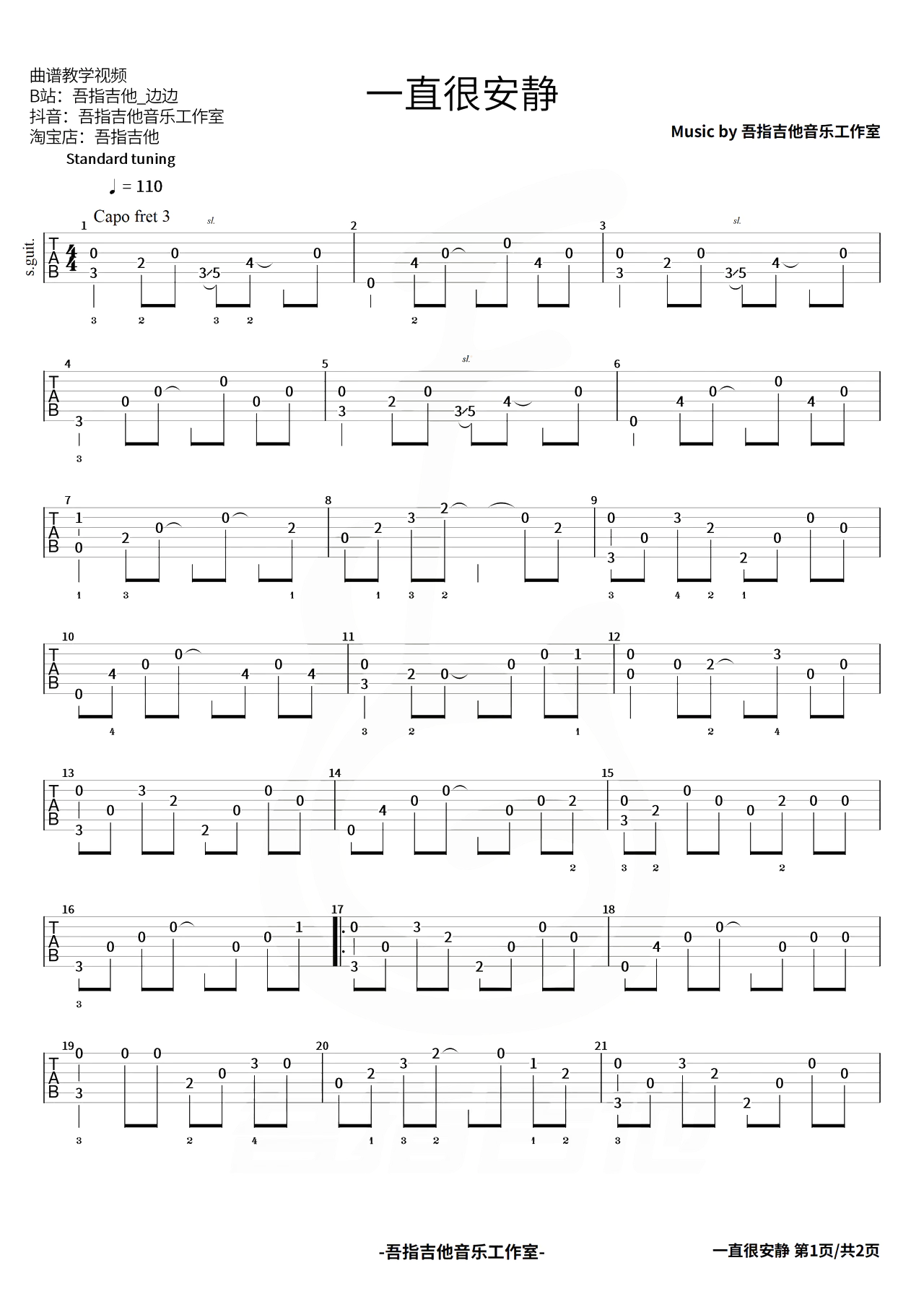 曲谱介绍: 一直很安静吉他谱,来自阿桑演唱的仙侠剧《仙剑奇侠传》插曲,旋律舒缓但略带悲凉感,安静的让我们感受着光阴的回放,感受曾经走过的悲伤,那些一去不复返的片段,让我们在聆听中用心去追忆吧。 《一直很安静》指弹吉他谱,速度控制在110拍每分钟,随谱附有《一直很安静》指弹演示+教学视频,可根据视频中的变调夹3品弹奏,共2张高清PNG图片谱例,指弹难度2/5。