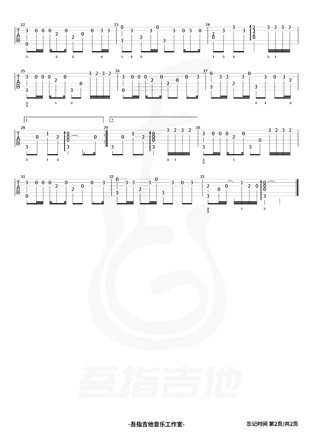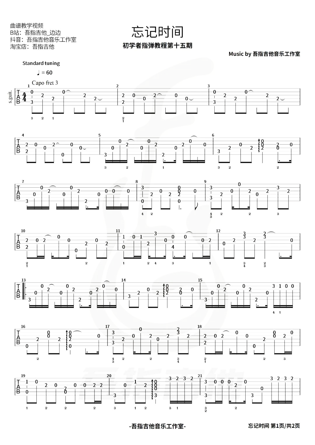 曲谱介绍: 本曲谱参考链接:     忘记时间指弹吉他谱,根据胡歌演唱的《仙剑3》片尾曲所改编,本指弹谱,共两张高清六线谱图例,CAPO推荐夹3品,速度控制在60拍每分钟,指弹难度2/5,适合想要练习指弹入门阶段的朋友练习。 这首《忘记时间》将光阴拉回到我们记忆中的仙侠世界,当旋律再次响起之时,让我们又仿佛看到了夕瑶对飞蓬千年孤独的爱,龙葵对龙阳孤注一掷的等待,是那么的让人动容。 指弹谱详情