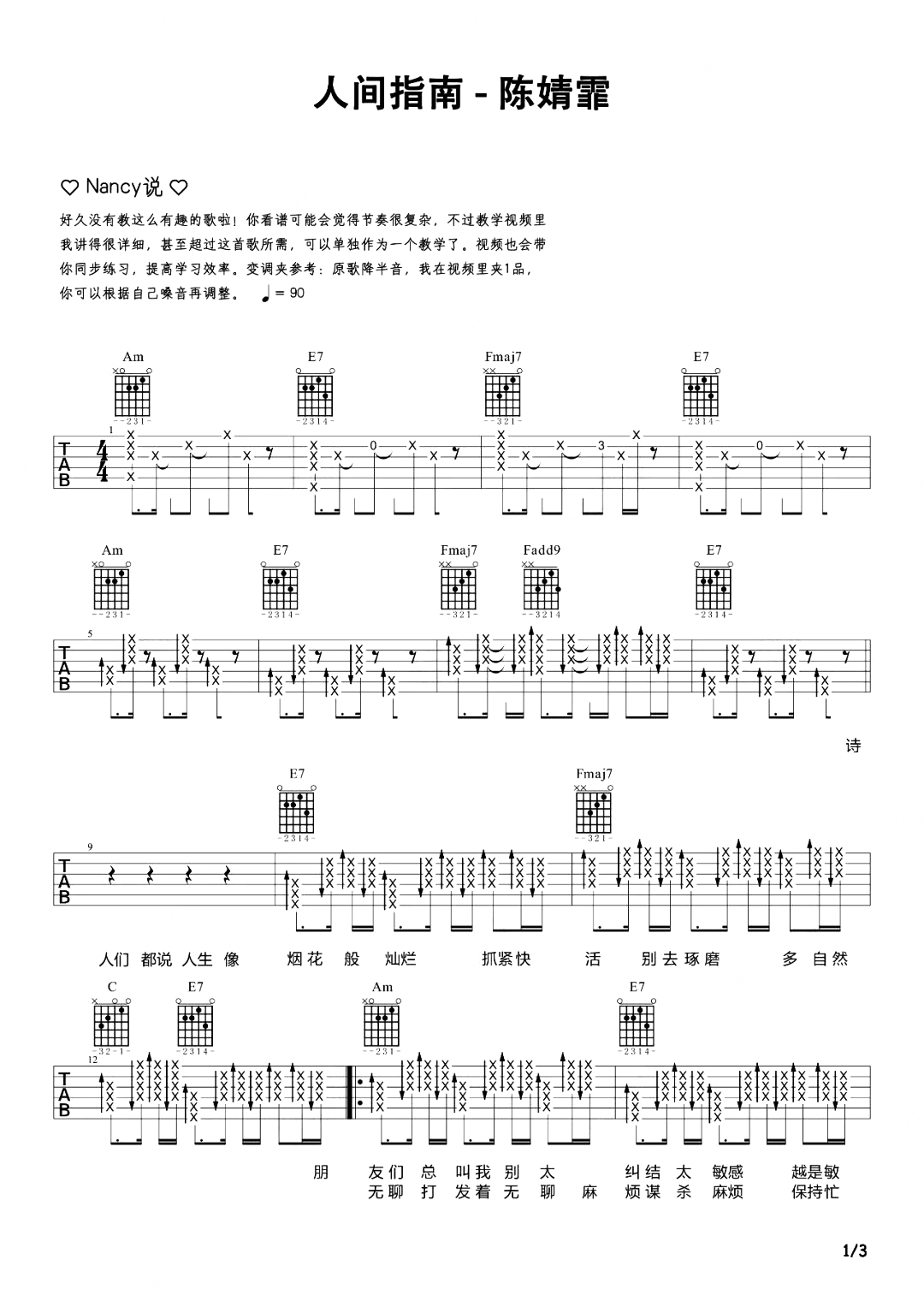 曲谱介绍: 《人间指南》吉他弹唱教学 人间指南吉他谱,陈婧霏演唱的歌曲。 《人间指南》吉他弹唱谱,共3张高清PNG吉他六线谱图例,弹唱原调需要降半音,随谱附《人间指南》吉他演示+教学视频,视频中是夹1品示范弹唱,可根据自己嗓音再做调整。