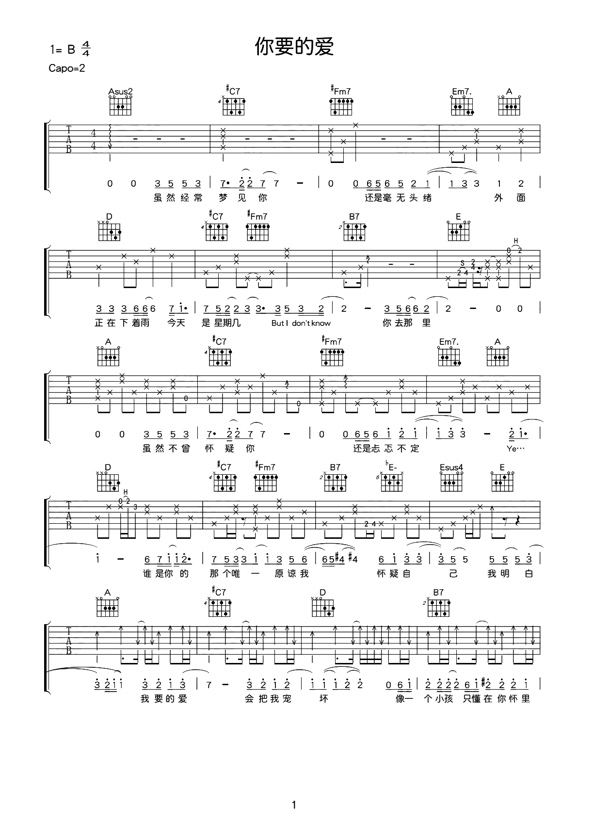 曲谱介绍: 你要的爱吉他谱,戴佩妮原唱,经典台湾偶像剧《流星花园》片尾曲。 《你要的爱》吉他弹唱谱,选用G调指法编配,原调B调,CAPO夹2品弹唱原调,随谱附《你要的爱》男生版弹唱演示视频,感兴趣的朋友可参考,还原度:90%,弹唱难度:4级。