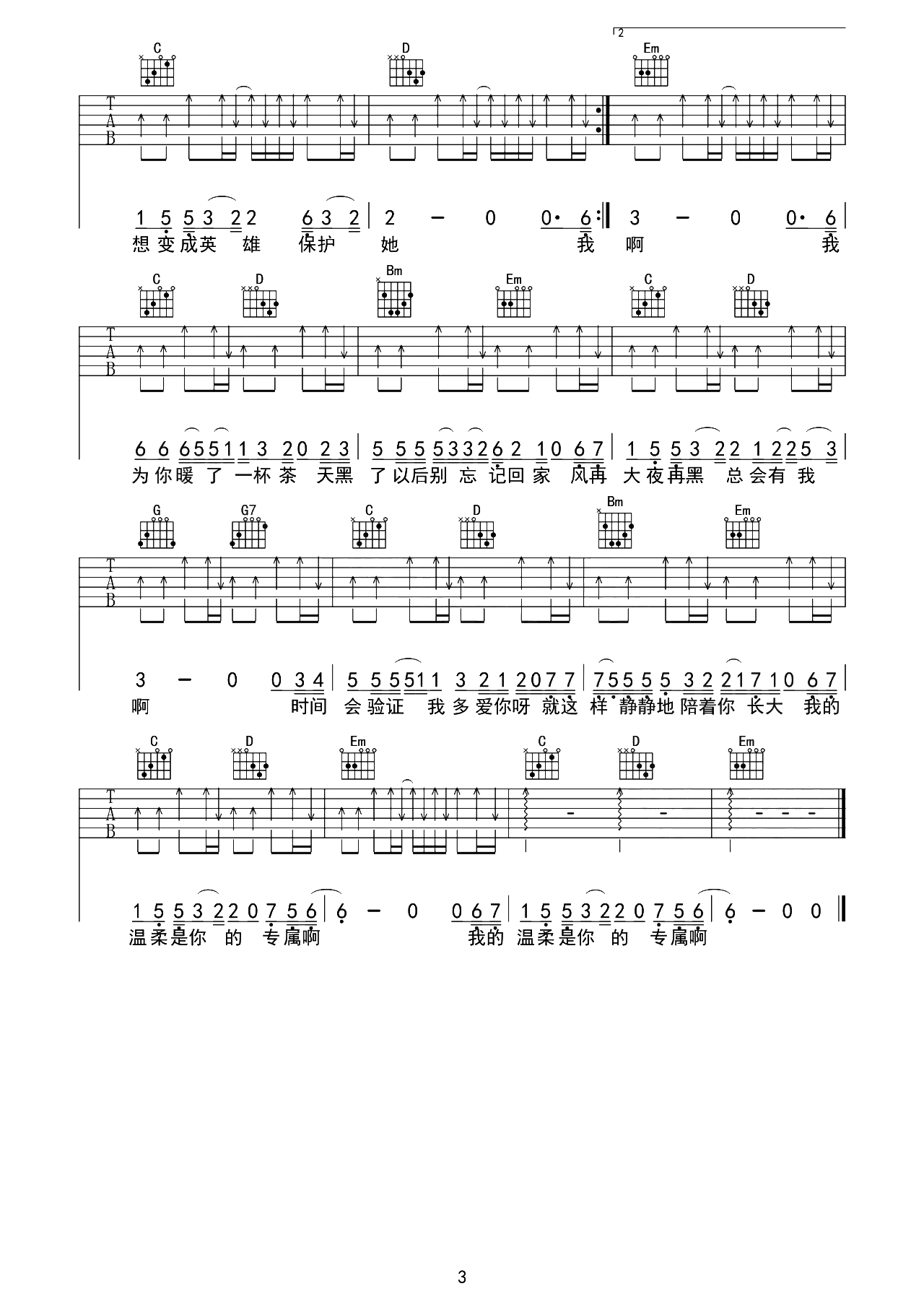 曲谱介绍: 暖一杯茶吉他谱,邵帅演唱的一首歌曲,外面风吹又雨打,我已为你暖一杯茶,记得天黑前赶紧回家,我要为你弹唱最美的“情话”。这首歌曲贴心又温暖,邵帅将这首歌表达出了浓烈的共鸣而又不腻。 《暖一杯茶》吉他弹唱谱,选用G调指法,按原版编配,全曲以扫弦节奏贯穿,共3张高清PNG吉他六线谱图例,还原度:85%,难度:3级。