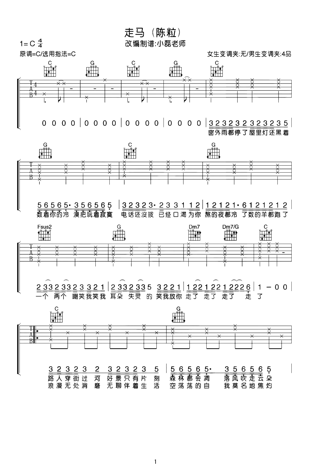 曲谱介绍: 《走马》吉他弹唱谱,选用C调指法编配,标准调音,女生无需使用变调夹,男生CAPO夹4品,随谱附《走马》吉他弹唱演示+教学视频,共4张高清PNG图片谱例,还原度:90%,难度:3级。 走马吉他谱,陈粒原唱的民谣歌曲,简单而清澈的演唱方式却深刻抓心,看似随性的“走马”,却描绘出爱情失而复得的美好瞬间,走马式的爱情并没有对与错,因为一个愿意走,一个愿意等。
