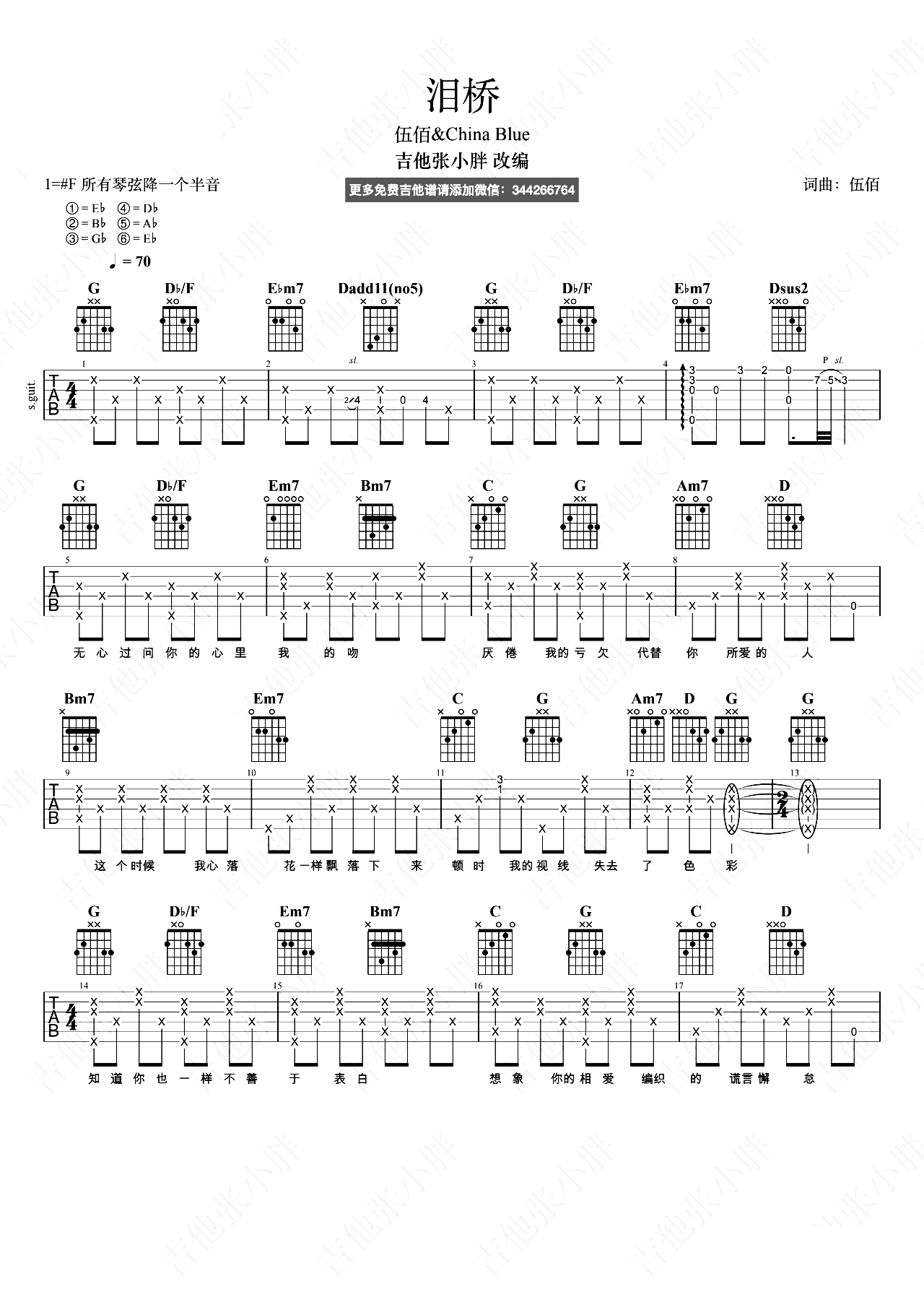 曲谱介绍: 泪桥吉他谱,伍佰演唱的歌曲,简单粗粝的演唱方式,通俗而又很有张力,独特的嗓音配合这首歌的意境,把人带入了一圈回忆中 《泪桥》吉他弹唱谱,选用F调指法,原调#F,弹唱需要降半音调弦,本谱按原版较细的编配,部分细节有加花,新手需要熟练掌握以下,共4张高清PNG吉他六线谱图例,还原度:90%,难度:4级。