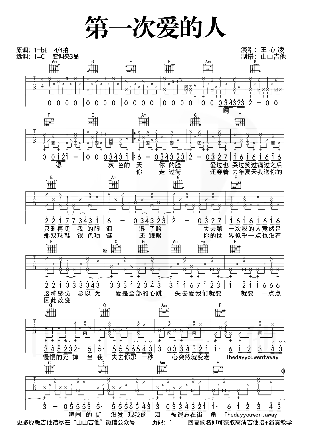 曲谱介绍: 《第一次爱的人》吉他弹唱教学 歌曲《第一次爱的人》的其他吉他谱版本:       第一次爱的人吉他谱,王心凌翻唱的温暖情歌,所有的心力都深深陷入第一次深爱的人,这首歌用畅快的演唱方式,拨动我们所有人心中的记忆与共鸣,难忘、无奈、在多年之后,甚至多了一些叹息。 《第一次爱的人》吉他弹唱谱,选用C调指法,超原版编配,如果需要弹唱原调,变调夹可夹3品弹回bE调,节奏4/4拍,含完整前奏,本版编配较细含拍弦+打板节奏,原版比例:95%,弹唱难度:5级。
