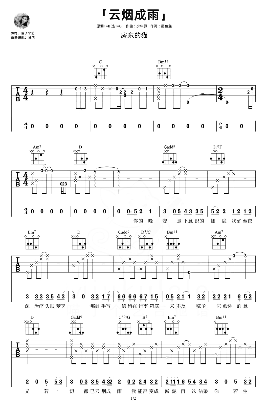 曲谱介绍: 云烟成雨吉他谱,房东的猫演唱的歌曲,记忆中的往事如云烟随风而逝,终究化成泪和雨,那些曾经习惯了的“晚安”如今已转变为了失眠的根源,舒缓的节奏,拉满了听众的情绪共鸣。 《云烟成雨》吉他弹唱谱,选用G调指法,原调B调,女生可夹3品弹唱原调,本谱共2张高清吉他六线谱图例,原版比例:90%,弹唱难度:3级,随谱附《云烟成雨》的吉他弹唱演示+教学视频,稍微会更新。