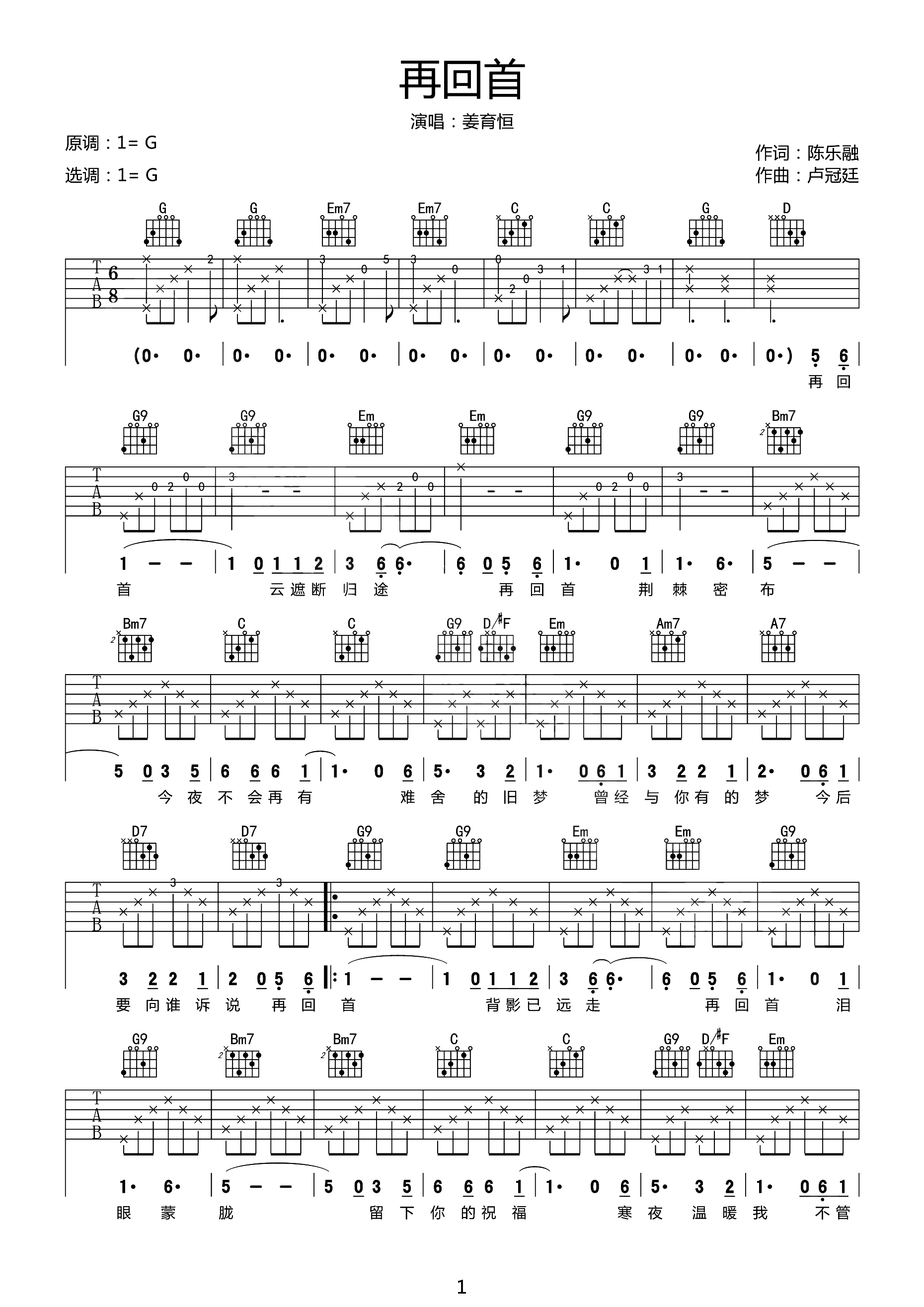 再回首吉他谱 - 姜育恒 - G调吉他弹唱谱 - 原版