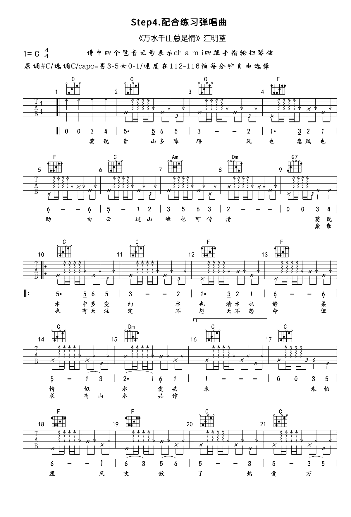 曲谱介绍: 万水千山总是情吉他谱,汪明荃演唱的粤语歌曲,同名电视剧主题曲,温柔似水的旋律奏响的是我们记忆深处的熟悉的港味,以包容万物的姿态,将感情满满的装进了歌曲之中,让我们体会到了万水千山之中蕴藏着的丰富情感。 《万水千山总是情》吉他弹唱谱,选用C调指法,原调#C,本谱为男女通用版本,男生变调夹3-5品,女生0-1品,弹唱速度控制在112-116拍每分钟,节奏4/4拍,原版比例:85%,难度5级。