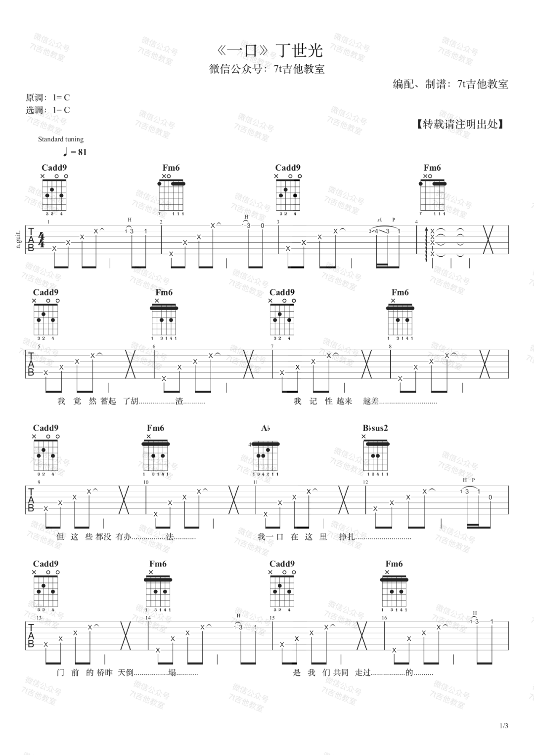 曲谱介绍: 《一口》吉他谱链接:     一口吉他谱,丁世光演唱,来自丁世光的宝藏歌曲和吉他的味道那么的合适,这首歌让我们领略到音乐总是最好的交流语言,我们在曲中感受到了日常与音乐的完美融合。 《一口》吉他弹唱谱,选用C调指法,变调夹夹在第3品,适合女生弹唱;男生也可以用这个谱子,不夹变调夹就是丁世光的原调哦,如果觉得太高可以降半音调弦。视频里是女生版的《一口》弹唱,标准音调弦,原版比例:90%,难度:4级。 弹唱技巧提示:本谱中的主要亮点,在于勾线+击弦,注意一下弹奏时的音色亮度,会让歌曲更加出彩。