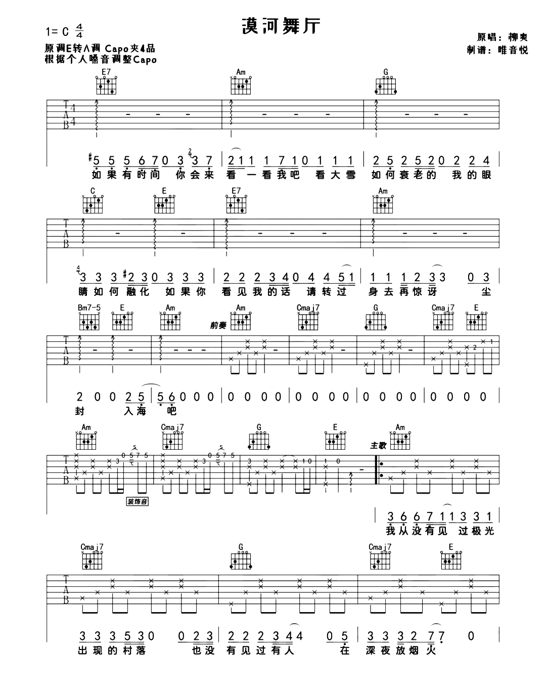 曲谱介绍: 《漠河舞厅》吉他弹唱教学 漠河舞厅吉他谱,柳爽演唱的网络热歌,背后的故事,沉重而能透出当时的甜蜜,随着旋律能感受难易释怀的那份长情,所有的情感每当超越了时间与空间之后,似乎不是谁的专属了,因为它的形态不再那么的重要,因为背后有着更深刻的意义… 《漠河舞厅》吉他弹唱谱,选用C调指法编配,原调E转A调,CAPO推荐夹4品弹唱,随谱附吉他弹唱演示+教学视频,本谱共3张高清PNG图片谱例,原版比例:95%,难度:4级。