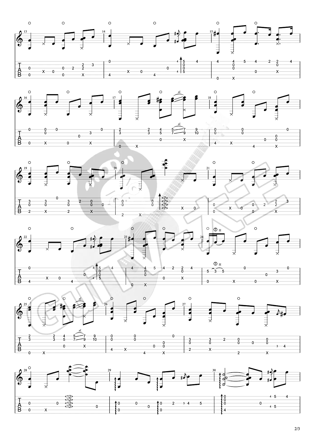 曲谱介绍: 蜗牛吉他谱,改变自周杰伦《蜗牛》的指弹曲目,共3张高清PNG图片谱例,随谱附有歌曲的指弹演示示范视频,琴友们弹奏的时候可参考练习。 弹奏小提示:x代表拍弦,o代表手腕打底鼓。