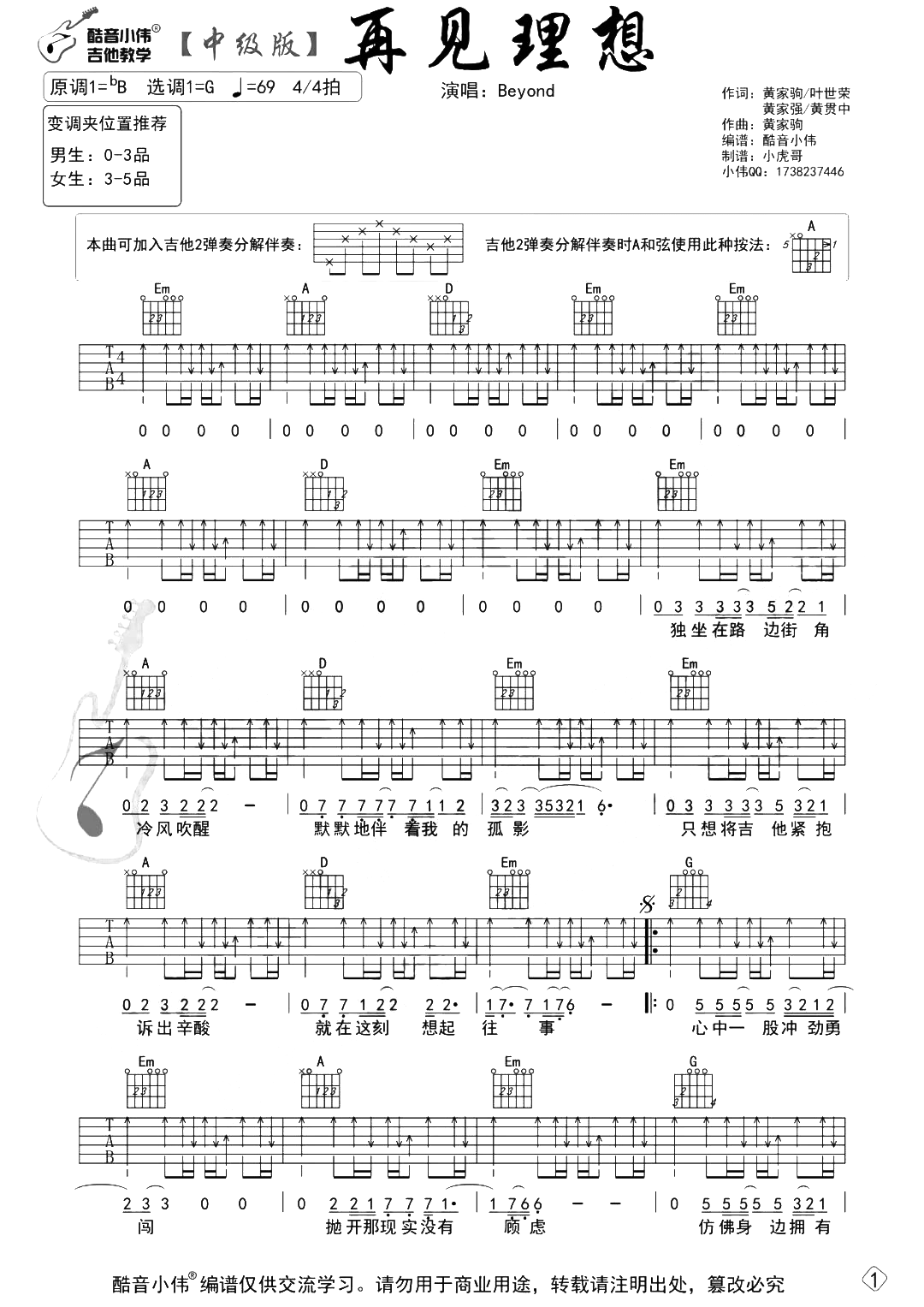 曲谱介绍: 再见理想吉他谱,Beyond的演唱的粤语歌曲,以Beyond为视角,诠释着心底的梦想被现实的黑暗给打压了,无比的感到无奈与绝望,但初心的冲劲在呐喊,从未褪去… 《再见理想》吉他弹唱谱,选用G调指法编配,原调bB,男生CAPO推荐0-3品,女生可以3-5品,本谱速度69拍每分钟,节奏4/4拍,随谱附《再见理想》吉他弹唱演示+教学视频,共2张高清PNG图片谱。