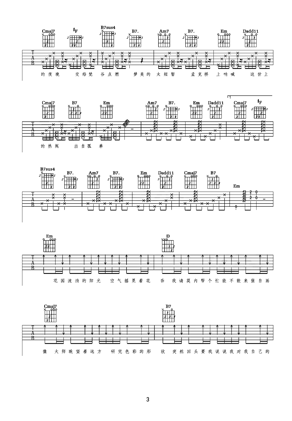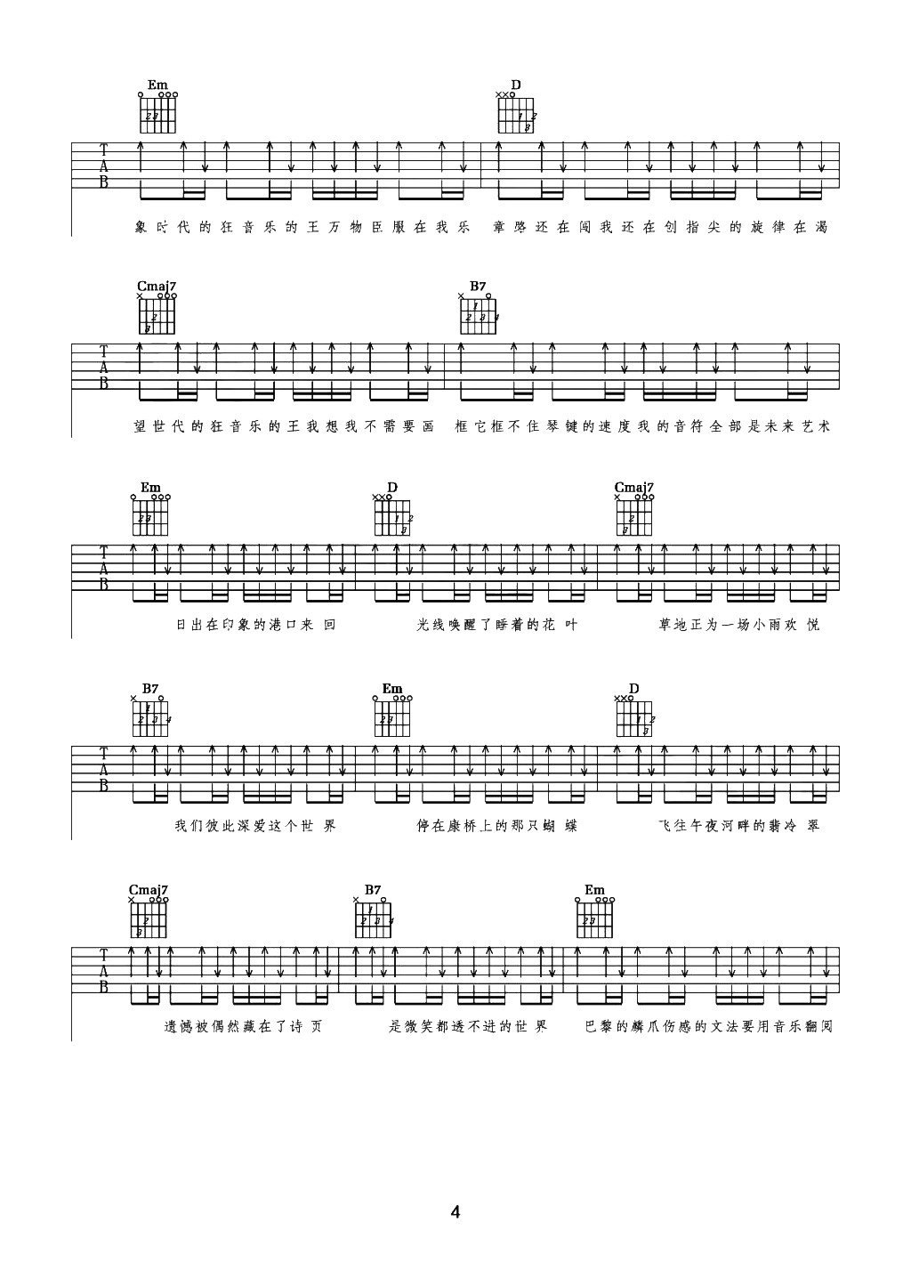 曲谱介绍: 《最伟大的作品》吉他谱其他优质版本推荐链接:       最伟大的作品吉他谱,周杰伦2022年演唱新曲,《最伟大的作品》吉他弹唱谱,选用C调指法,原调bB,节奏4/4拍,弹唱难度:5级适中,本谱涉及到拍弦技巧,前面部分需要注意十六分休止符的节奏感,可参考演示视频。 《伟大的作品》在巴黎用“穿越”的形式致敬了许多伟人,深层含义值得让人细品,杰伦用歌曲将其串联在一起,用“艺术”巧妙的表达艺术,让大师们的隔空对话,仿佛诠释着最伟大的作品终归来自于生活,而时刻都在记录着…