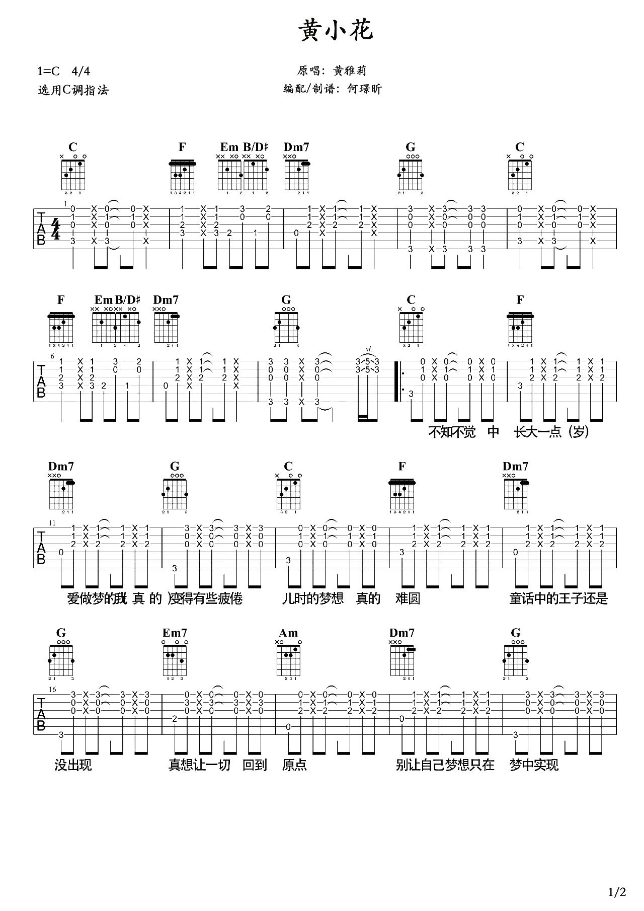 曲谱介绍: 黄小花吉他谱,黄雅莉演唱,《黄小花》吉他弹唱谱,选用C调指法编配,无需使用变调夹,节奏4/4拍,本谱以拍弦的方式弹唱,简单清新,十分好听,难度:4级较简单,需要注意下节奏延音的熟练把握。