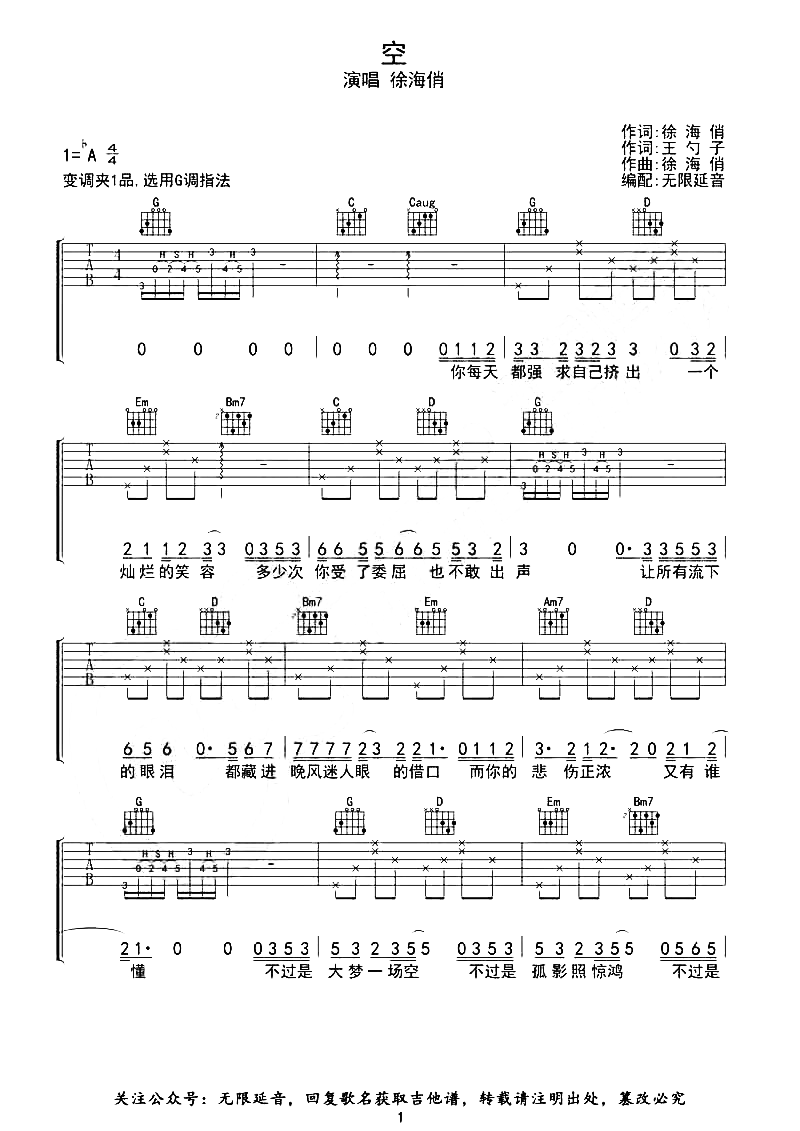 曲谱介绍:   空吉他谱,徐海俏演唱的歌曲 《空》吉他弹唱谱,选用G调指法,原调bA,CAPO夹1品,共3张高清图片谱例,按原版编配,难度:2级简单。