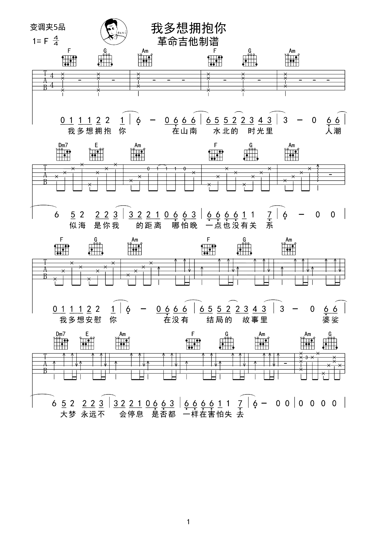 曲谱介绍: 本歌曲的其他吉他谱版本链接:     我多想拥抱吉他谱,黑屋乐队演唱,舒缓中带着深情,诠释着满心期许的爱意,最心底的冲动,就是奔向你,拥抱你,拥有你,在山南水北的时光里,我不想变成空欢喜。 《我多想拥抱你》吉他弹唱谱,选用C调指法,原调F调,共3张高清图片谱例,按原版的节奏进行编配,原版比例:90%,难度:2级,简单易上手,随谱附演示+教学视频,稍后会更新。