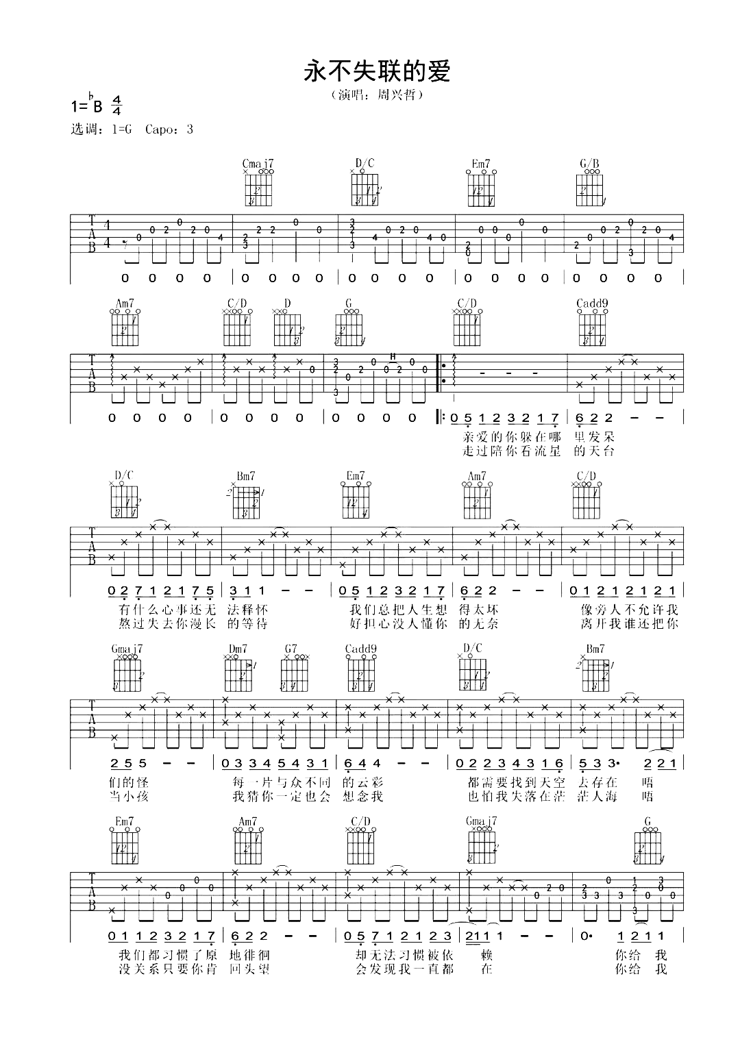 曲谱介绍:   永不失联的爱吉他谱,是周兴哲原唱的情歌,旋律舒缓悠扬,细腻贴切的歌词,渴望着爱情的永存,点滴的过往浓情而入心,对于失去你,是永远都不想要的答案。 《永不失联的爱》吉他弹唱谱,选用G调指法,原调bB,节奏4/4拍,变调夹需夹3品弹唱原调,这个版本为周兴哲演唱,所以是以男生为参考,原版比例:90%,弹唱难度:4级。