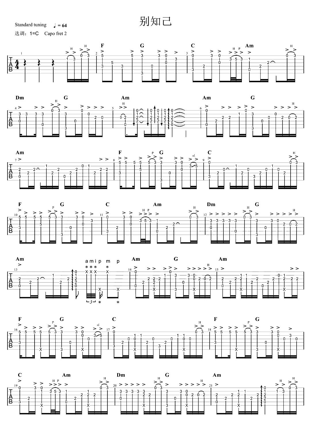 曲谱介绍: 别知己指弹吉他谱,改编自海来阿木的曲目,共2张高清图片谱,选用C调指法,CAPO夹2品弹奏,速度64拍每分钟,节奏4/4拍,指弹弹奏难度:3级。 舒适的旋律却不乏深情的层次表达,甜美的爱情背后总夹杂着离别的相似之苦,那些点滴的片刻记忆,总缠绕在无数个日夜之中,难以褪去。