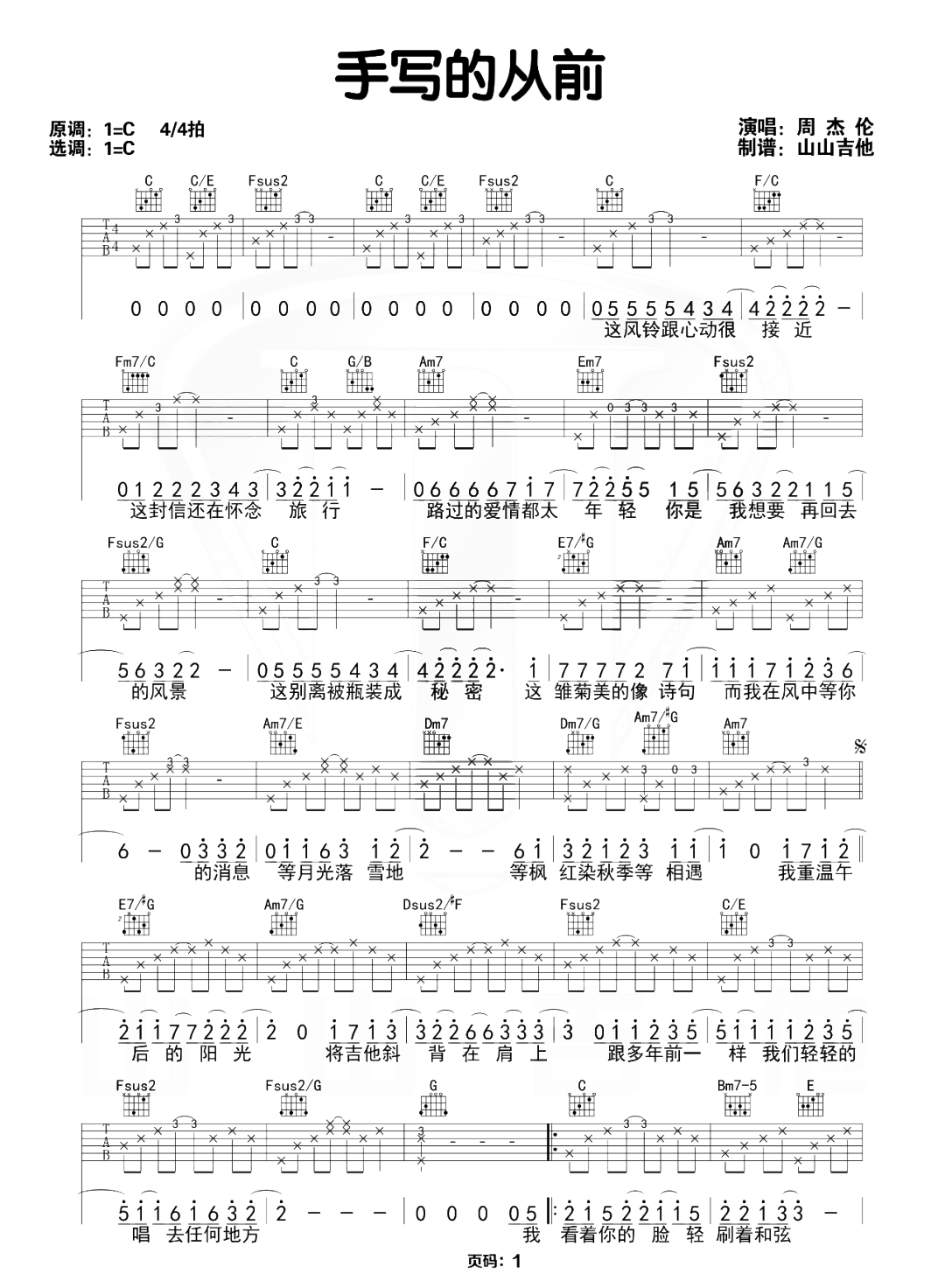 曲谱介绍: 《手写的从前》吉他弹唱教学 手写的从前吉他谱,周杰伦的回忆情歌,清新的旋律慵懒的唱腔述说着青春的故事 《手写的从前》吉他弹唱谱,选用C调指法,标准调音无需使用变调夹,节奏4/4拍,含前奏按原版编配,随谱附演示+教学视频,弹唱难度:3级,共3张高清图片谱例。
