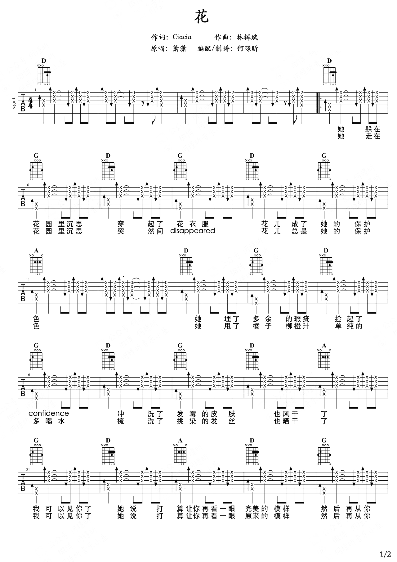 曲谱介绍: 花吉他谱,萧潇演唱的清新歌曲,《花》吉他弹唱谱,共2张高清图片谱例,全曲扫弦节奏贯穿,按原版编配,还原比例:90%,弹唱难度:3级。