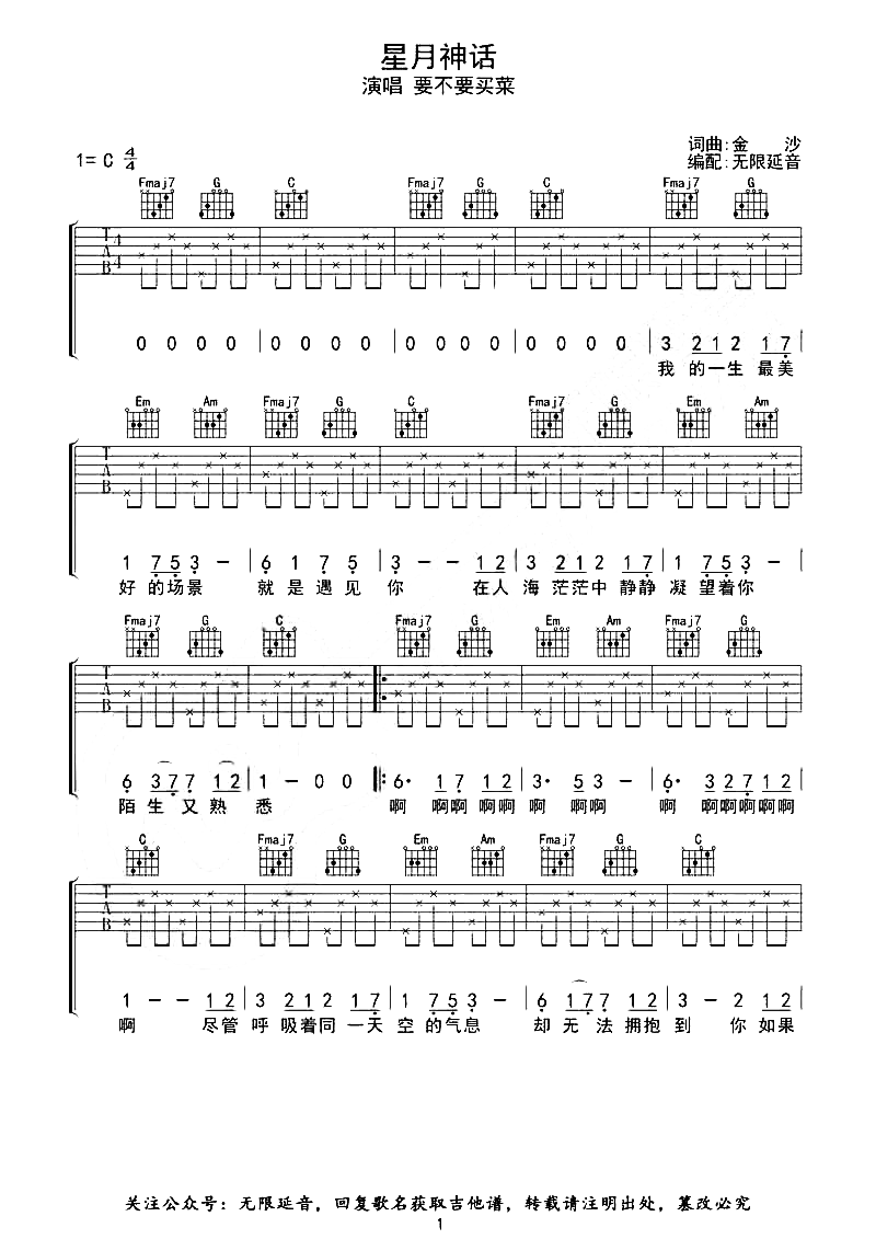 曲谱介绍:   星月神话吉他谱,要不要买菜翻唱金莎的一首歌曲,熟悉的旋律是我们深刻的记忆,让我们回想起《神话》电视剧中的点滴,千年的穿越,只为拥你与星月相伴,化成最美丽的样子,印入我心间。 《星月神话》吉他弹唱谱,选用C调指法,共2张高清图片谱例,由于是男声音调,无需使用变调夹,如果觉得较低,可适当调整变调夹,原版比例:85%,难度:3级,大家可参考随谱演示片段。