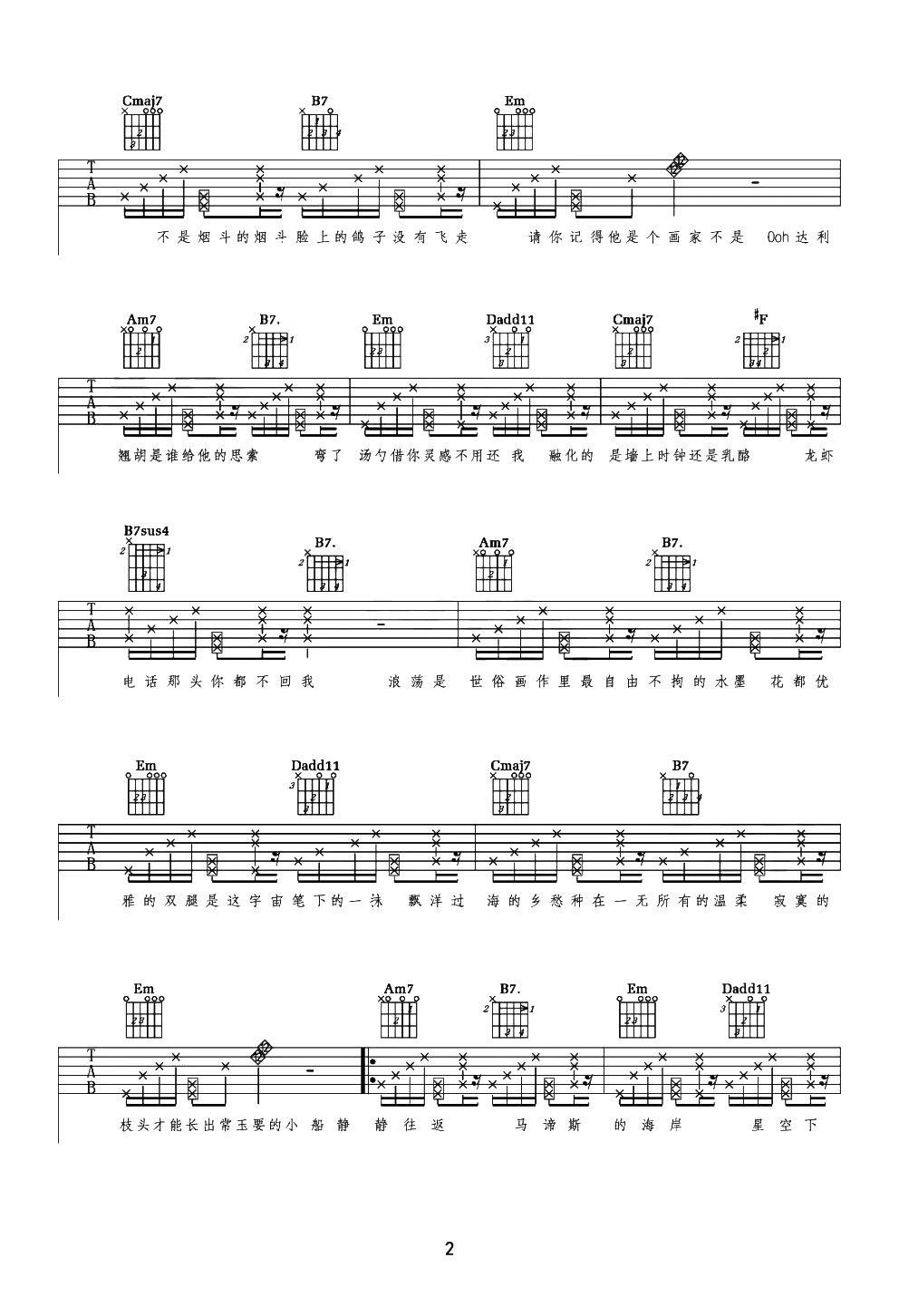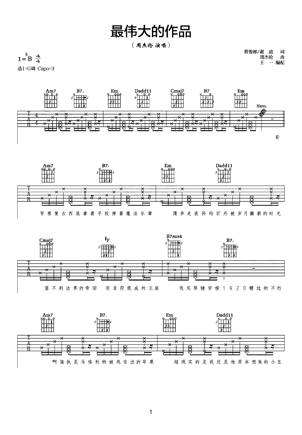 曲谱介绍: 《最伟大的作品》吉他谱其他优质版本推荐链接:     最伟大的作品吉他谱,周杰伦2022年演唱新曲,《最伟大的作品》吉他弹唱谱,选用C调指法,原调bB,节奏4/4拍,弹唱难度:5级适中,本谱涉及到拍弦技巧,前面部分需要注意十六分休止符的节奏感,可参考演示视频。 《伟大的作品》在巴黎用“穿越”的形式致敬了许多伟人,深层含义值得让人细品,杰伦用歌曲将其串联在一起,用“艺术”巧妙的表达艺术,让大师们的隔空对话,仿佛诠释着最伟大的作品终归来自于生活,而时刻都在记录着…