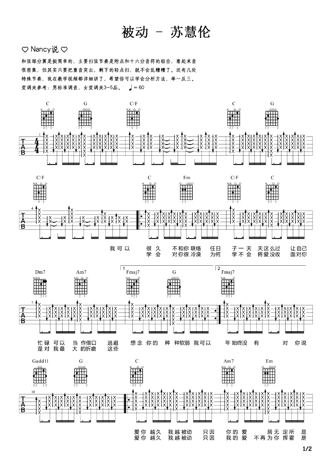 曲谱介绍: 被动吉他谱,苏慧伦演唱,原唱是伍佰。 《被动》吉他弹唱谱,共2张高清图片谱,男生无需变调夹,女生3-5品皆可以,主要以扫弦节奏贯穿,速度60BPM,节奏4/4拍,难度2级简单。