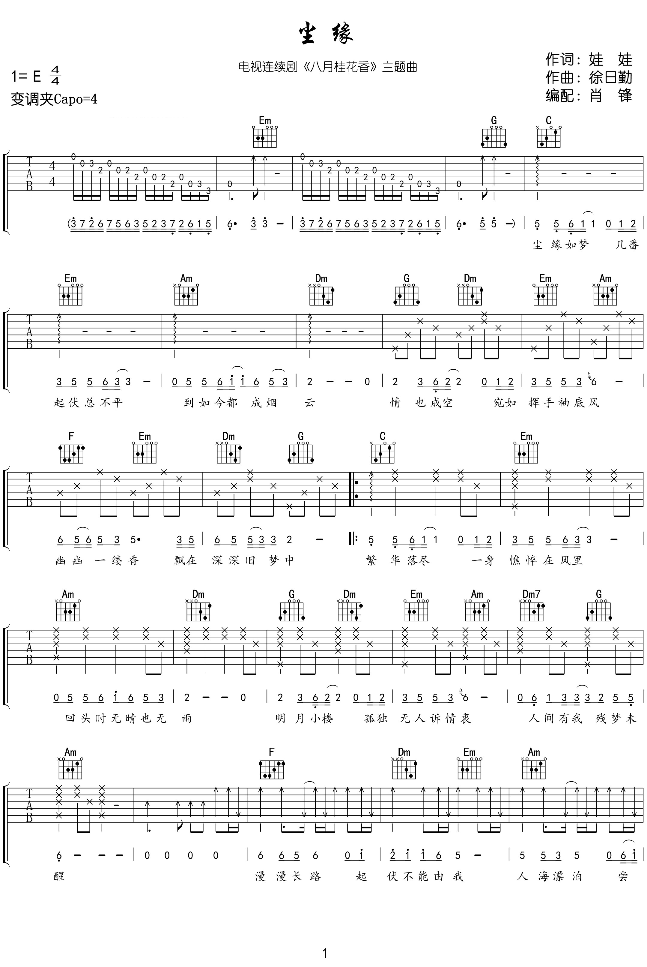 曲谱介绍:   尘缘吉他谱,徐日勤演唱的歌曲,《八月桂花香》主题曲。 《尘缘》吉他弹唱谱,选用C调指法,CAPO夹4品弹回原调E调,按原版编配含前奏,随谱附《尘缘》弹唱音频示范,难度:3级较简单,共2张高清图片谱例。