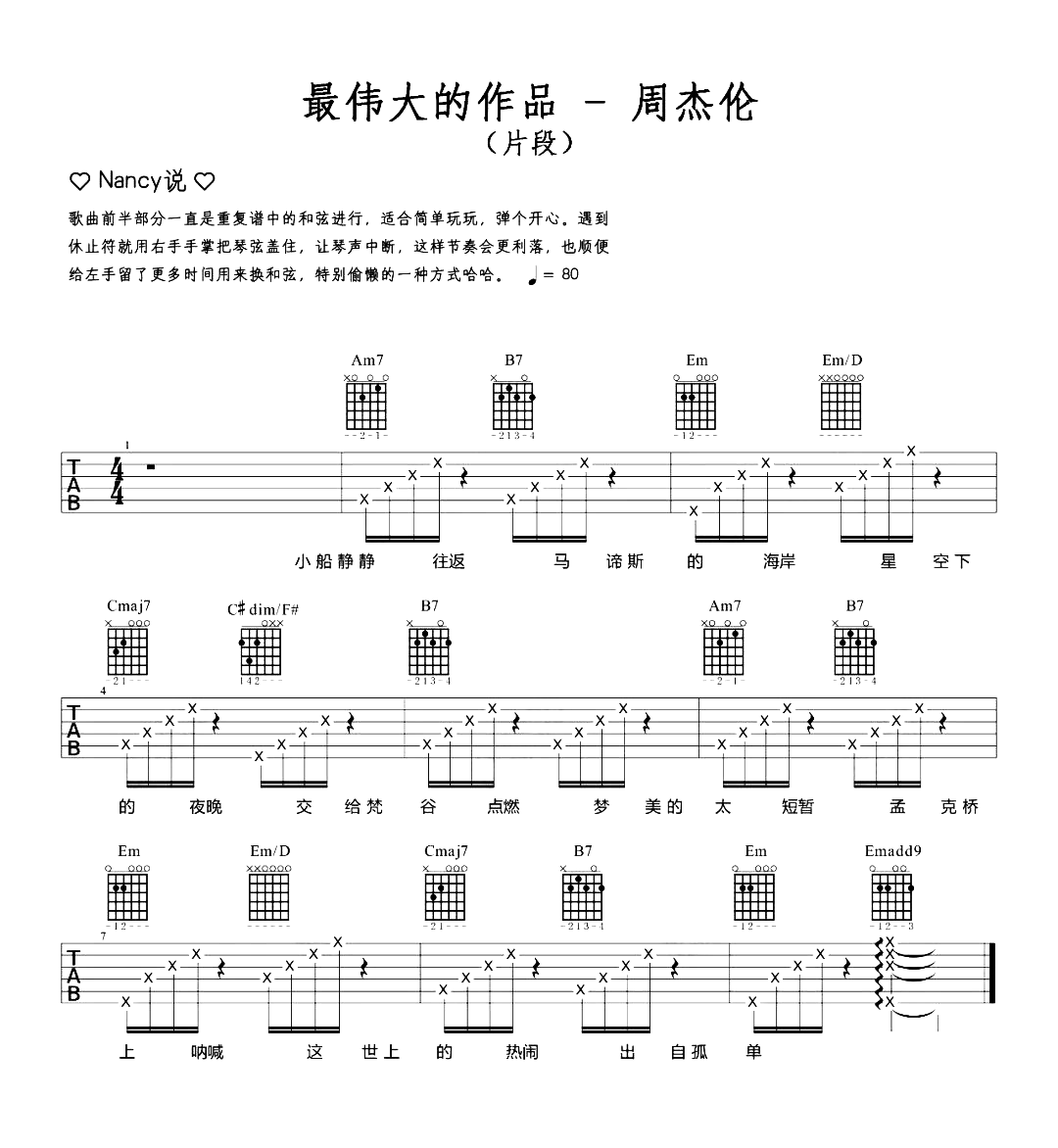曲谱介绍: 本歌曲的其他完整版吉他谱链接:     《最伟大的作品》吉他谱,共1张片段六线谱,总共分了8个小节,比较适合快速上手,简单玩玩弹个开心,男声可不用变调夹,遇到休止符的时候就用右手手掌把琴弦盖住中止琴声即可,速度控制在80BPM,节奏4/4拍,难度:3级。 杰伦的新歌一出,热度一直没有休止,也许他想带我们看尽世界最伟大的作品,而在我们歌迷心中,期待已久的其实就是关于他的歌曲。