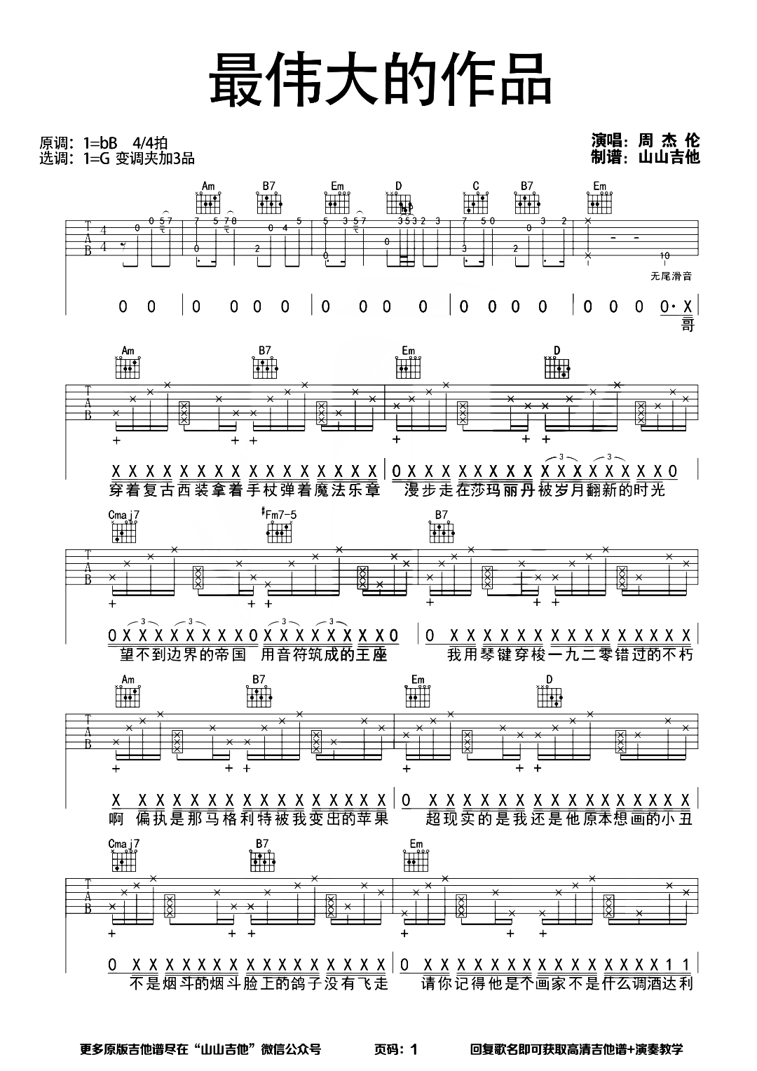 曲谱介绍: 本歌曲吉他谱链接:     最伟大的作品吉他谱,周杰伦演唱的歌曲,这是周杰伦一首情绪和结构丰富的全新作品,穿越时空,带大家来到艺术家的身边,把绘画、文学、音乐巧妙的融合在一起,以自己的方式表达出来,可谓精彩绝伦。 《最伟大的作品》吉他弹唱谱,选用G调指法,CAPO夹3品弹唱原调bB,节奏4/4拍,本谱除了较接近原版之外,使用了拍弦+打板的方式进行编配,整体试听感又会不一样,弹唱难度:5级适中,共4张高清图片谱例。