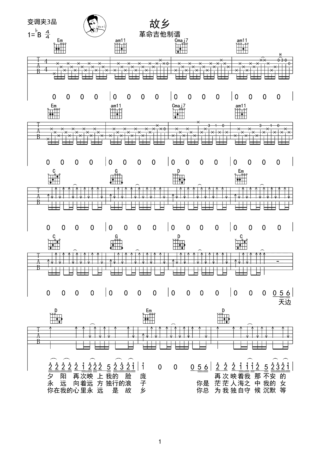 曲谱介绍: 《故乡》吉他弹唱谱,选用G调指法编配,原调bB,变调夹夹3品弹唱原调,本谱含完整前奏版本完整还原度不错,难度:4级较简单。 故乡吉他谱,许巍演唱的歌曲,北漂的浪子牵挂着故乡的心,这首歌以许巍的视角诠释着与妻子相隔两地的相思之情,很多时候人们对故乡的点滴思绪,往往都是和人密不可分的,而这首歌正是想表达这样的情感。