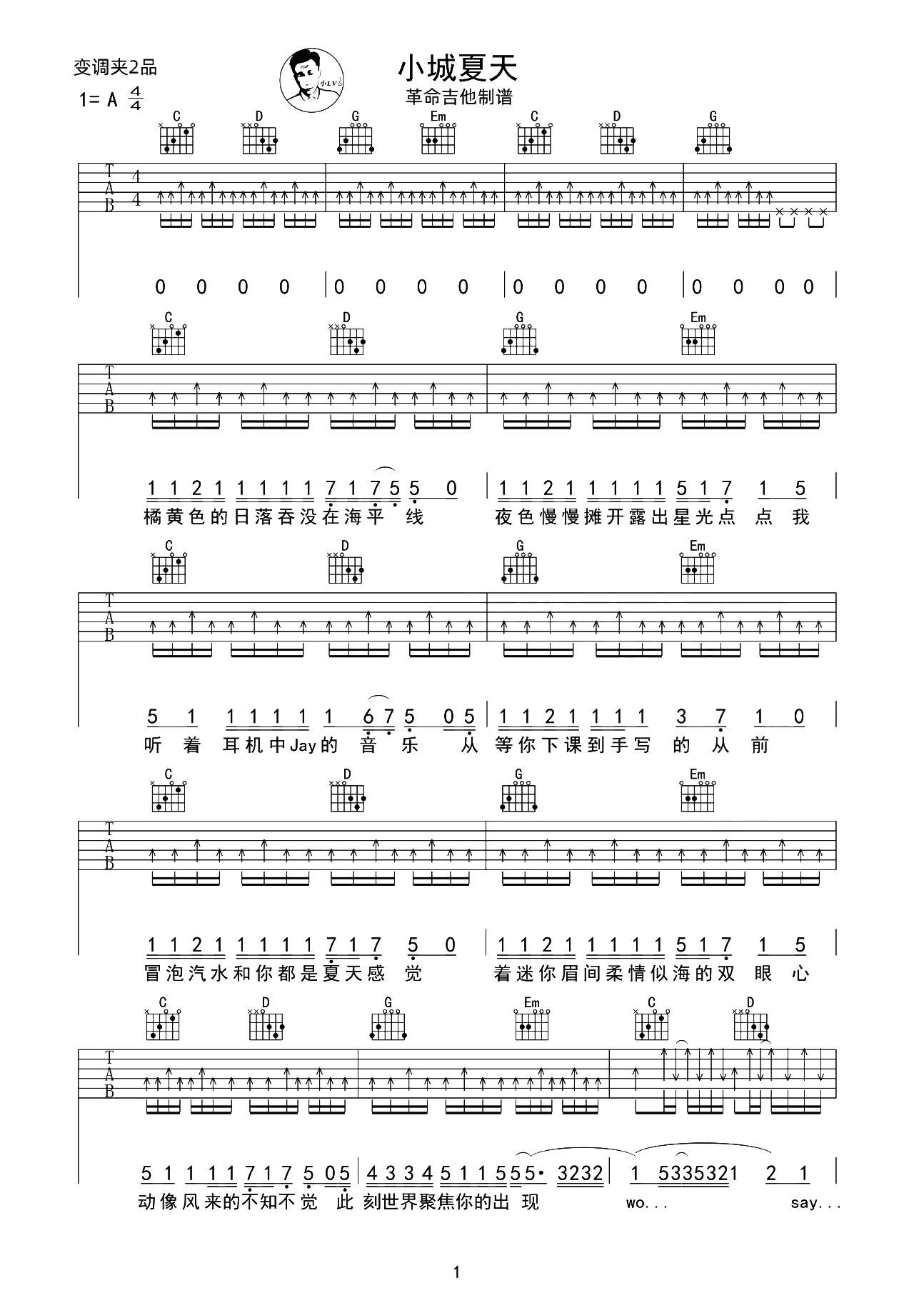 曲谱介绍: 小城夏天吉他谱,利比演唱的歌曲,Free的感觉融入了流行音乐与轻摇滚,让我们感受到了小城夏天的清爽与愉悦,那是远离城市喧嚣的快乐与轻松,也许这就是小城夏天给我们的完美感受。 《小城夏天》吉他弹唱谱,选用G调指法,原调A调,变调夹推荐夹2品弹唱原调,共2张高清图片谱例,扫弦节奏贯穿全曲,弹唱难度:2级简单,提示:注意把握一下扫弦的速度和频率,具体可参考视频教程。
