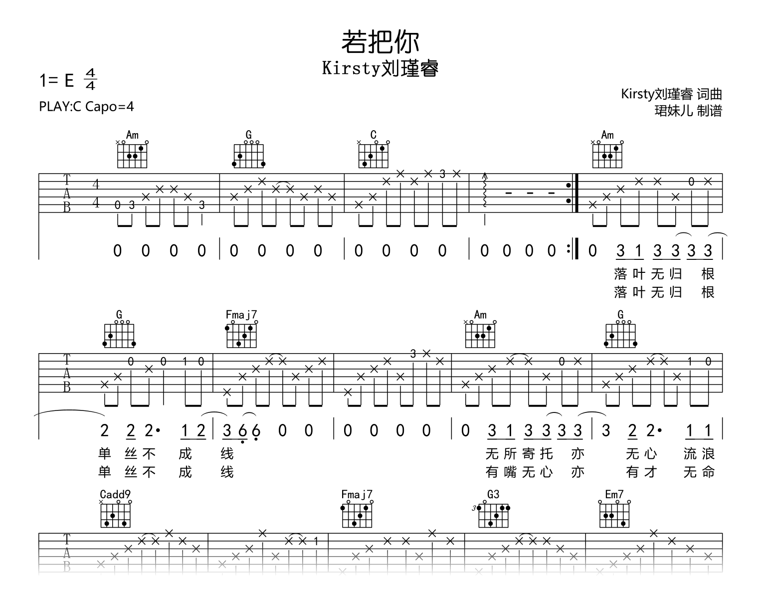 曲谱介绍: 若把你吉他谱,《我的音乐你听吗》节目,选手Kirsty刘瑾睿献唱,《若把你》吉他弹唱谱,原调E,采用C调指法编配,弹唱建议变调夹4品,速度85BPM,难度较简单,易上手。