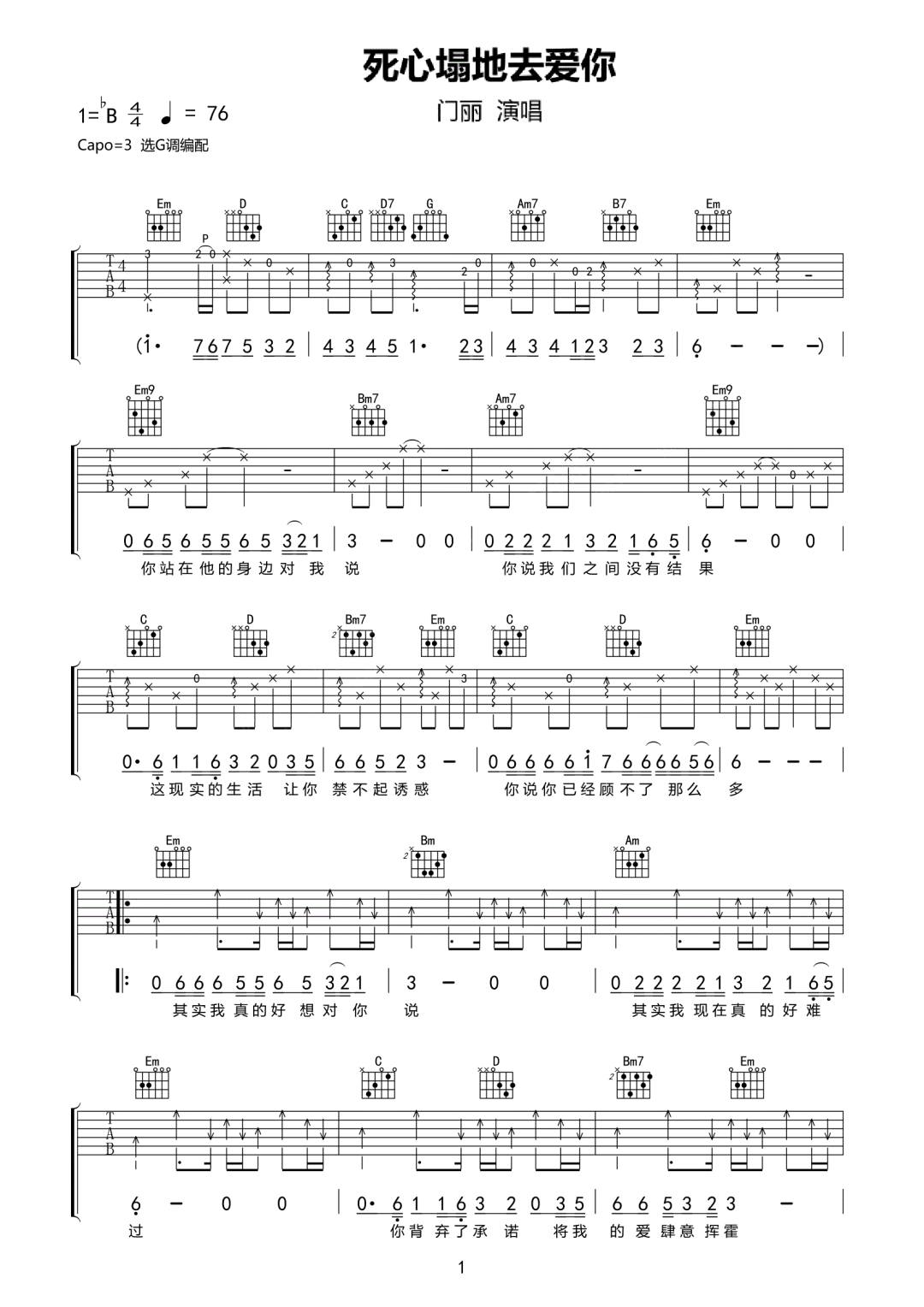 死心塌地去爱你吉他谱 - 门丽 - G调吉他弹唱谱 - 原版