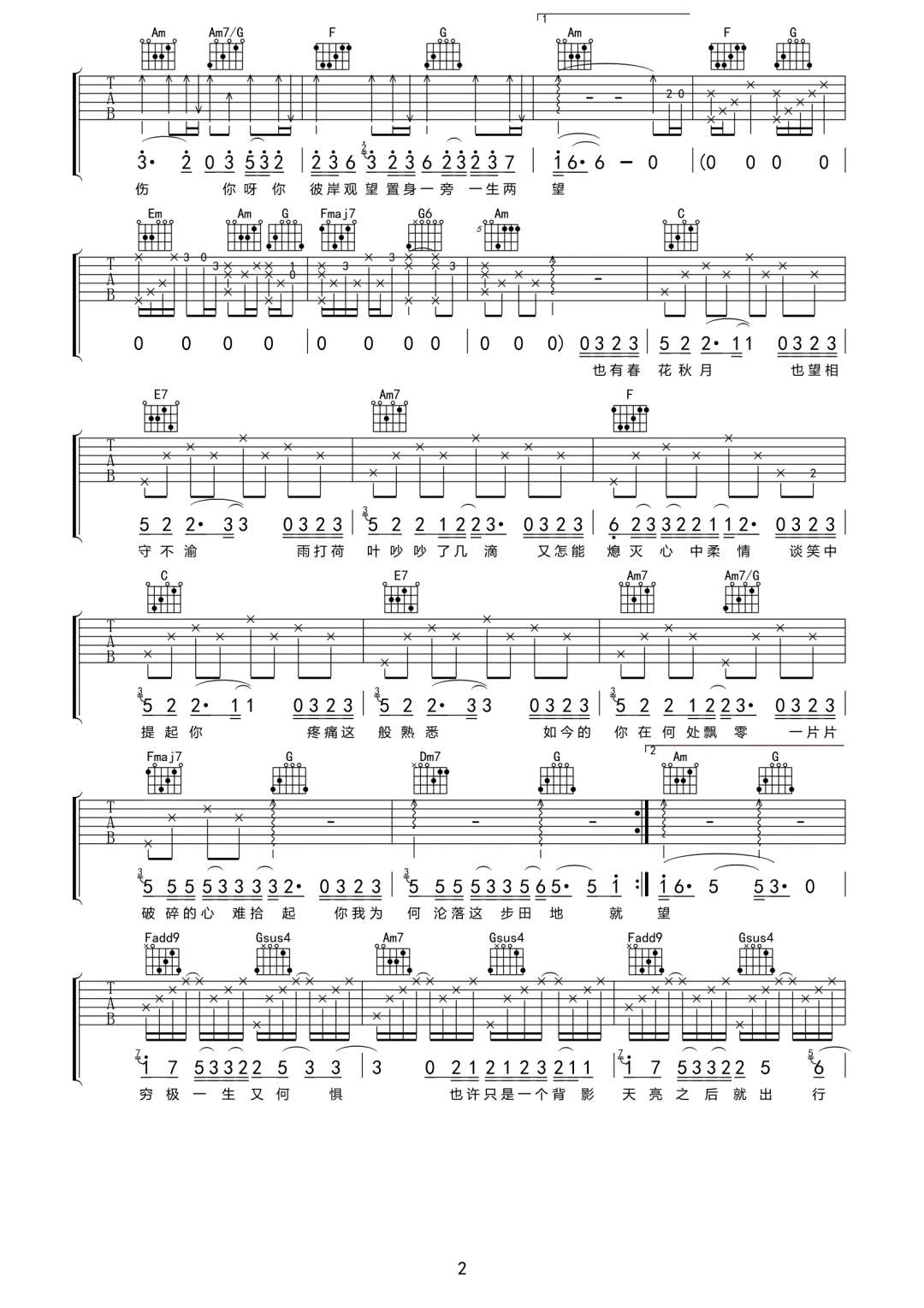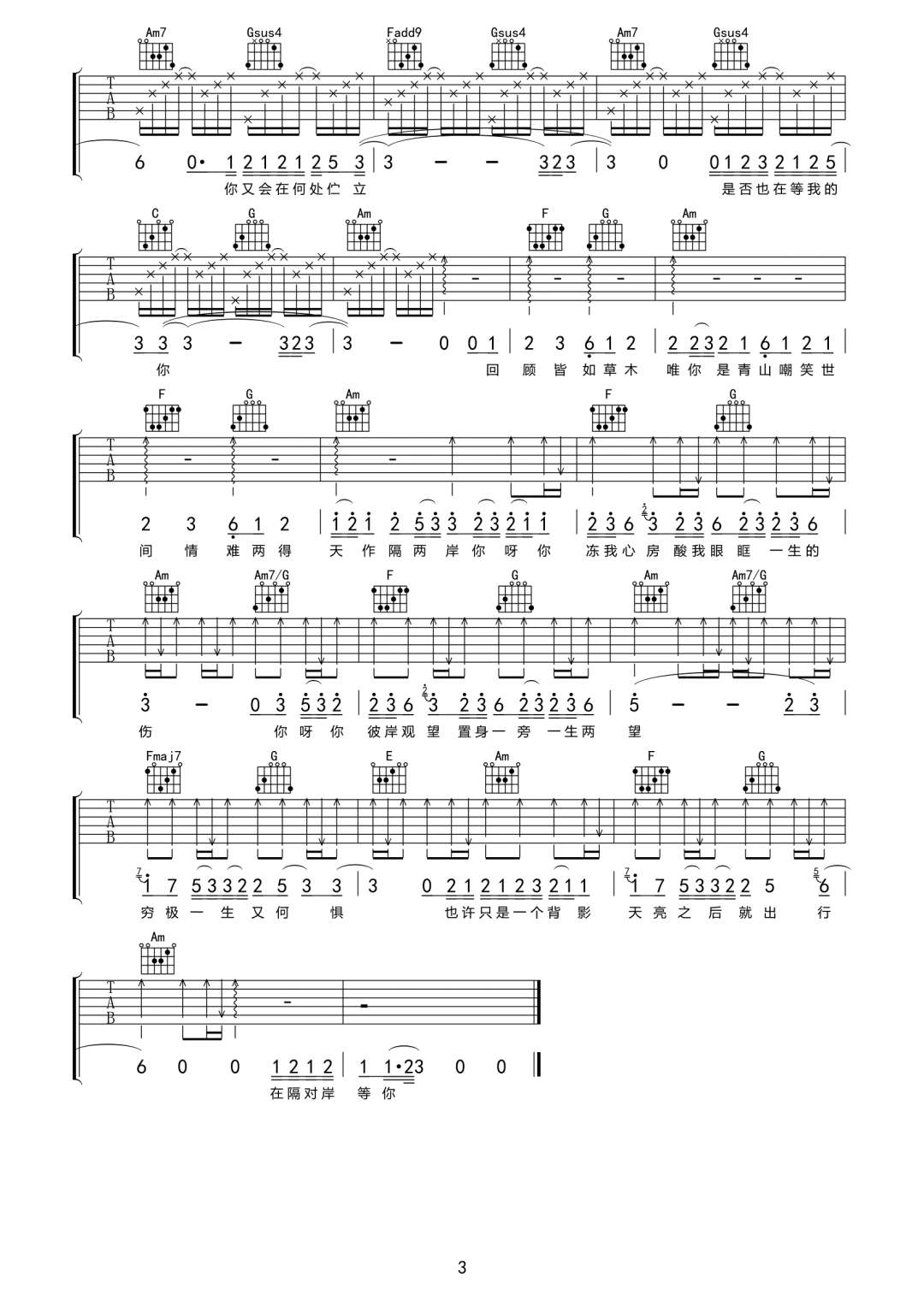 曲谱介绍: 吉他谱介绍:隔岸吉他谱,姚六一演唱的一首歌曲,4/4拍的节奏,这首歌曲的原调为D调,这里曲谱采用了C调指法进行编配,演唱时夹变调夹2品可回到原调,也可根据个人实际嗓音情况选择。曲谱由琴谱网更新上传,共3张高清图片弹唱吉他谱例,曲谱来源于网络转载,编配制谱者暂不详。