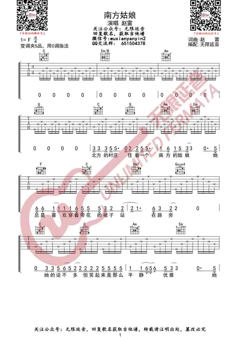 曲谱介绍: 吉他谱介绍:南方姑娘吉他谱,赵雷演唱的一首歌曲,4/4拍的节奏,这首歌曲的原调为F调,这里曲谱采用了C调指法进行编配,演唱时夹变调夹5品可回到原调,也可根据个人实际嗓音情况选择。曲谱由琴谱网更新上传,共5张高清图片弹唱吉他谱例,来源于@无限延音编配出品。