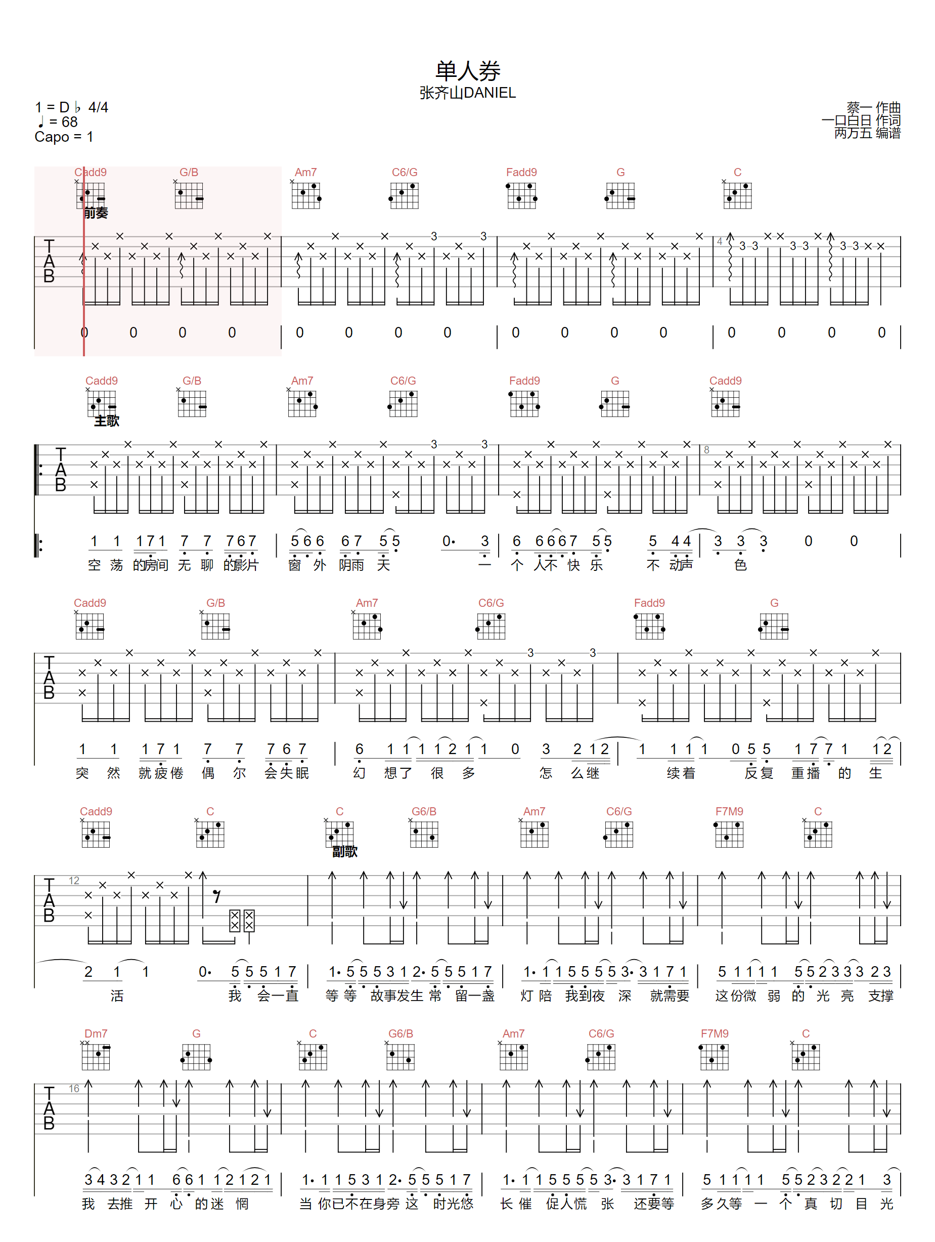 单人券吉他谱 - 张齐山DanieL - C调吉他弹唱谱 - 原版