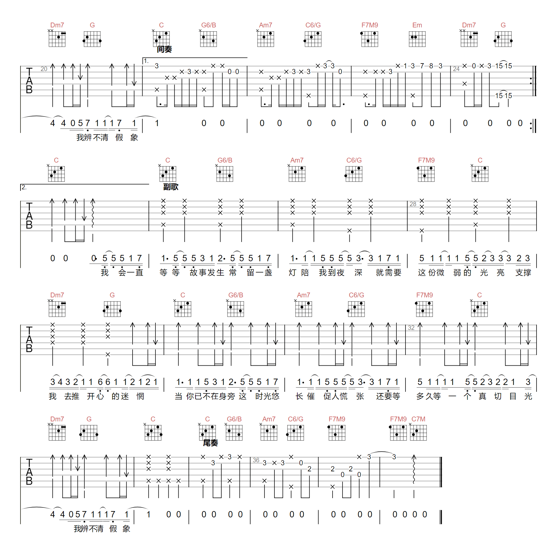 曲谱介绍: 吉他谱介绍:单人券吉他谱,张齐山DanieL演唱的一首歌曲,4/4拍的节奏,这首歌曲的原调为降D调,这里曲谱采用了C调指法进行编配,演唱时夹变调夹1品可回到原调,也可根据个人实际嗓音情况选择。曲谱由琴谱网更新上传,共2张高清图片弹唱吉他谱例,来源于@两万五编配出品。这首歌是张齐山DanieL的一首网络热门治愈单曲,“我会一直等,等故事发生,常留一盏灯,陪我到夜深,就需要这份微弱的光亮,支撑我去推开心的迷惘。”