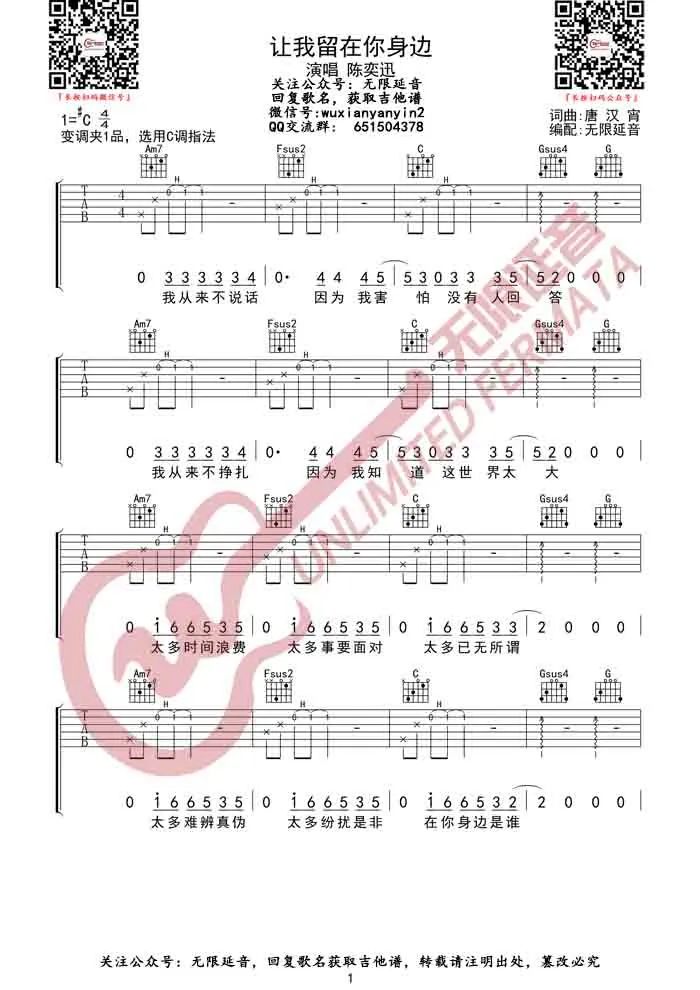 曲谱介绍: 吉他谱介绍:让我留在你身边吉他谱,陈奕迅演唱的一首歌曲,4/4拍的节奏,这首歌曲的原调为#C调,这里曲谱采用了C调指法进行编配,演唱时夹变调夹1品可回到原调,也可根据个人实际嗓音情况选择。曲谱由琴谱网更新上传,共4张高清图片弹唱吉他谱例,来源于@无限延音编配出品。这首歌“非常有冲劲,让人鼓舞”,它同时也会让每个人感受到曾经经历过的“很多情绪、很多回忆、很多片段”。旋律的前半部分低声吟唱,到副歌时放肆高歌,燃到炸裂。