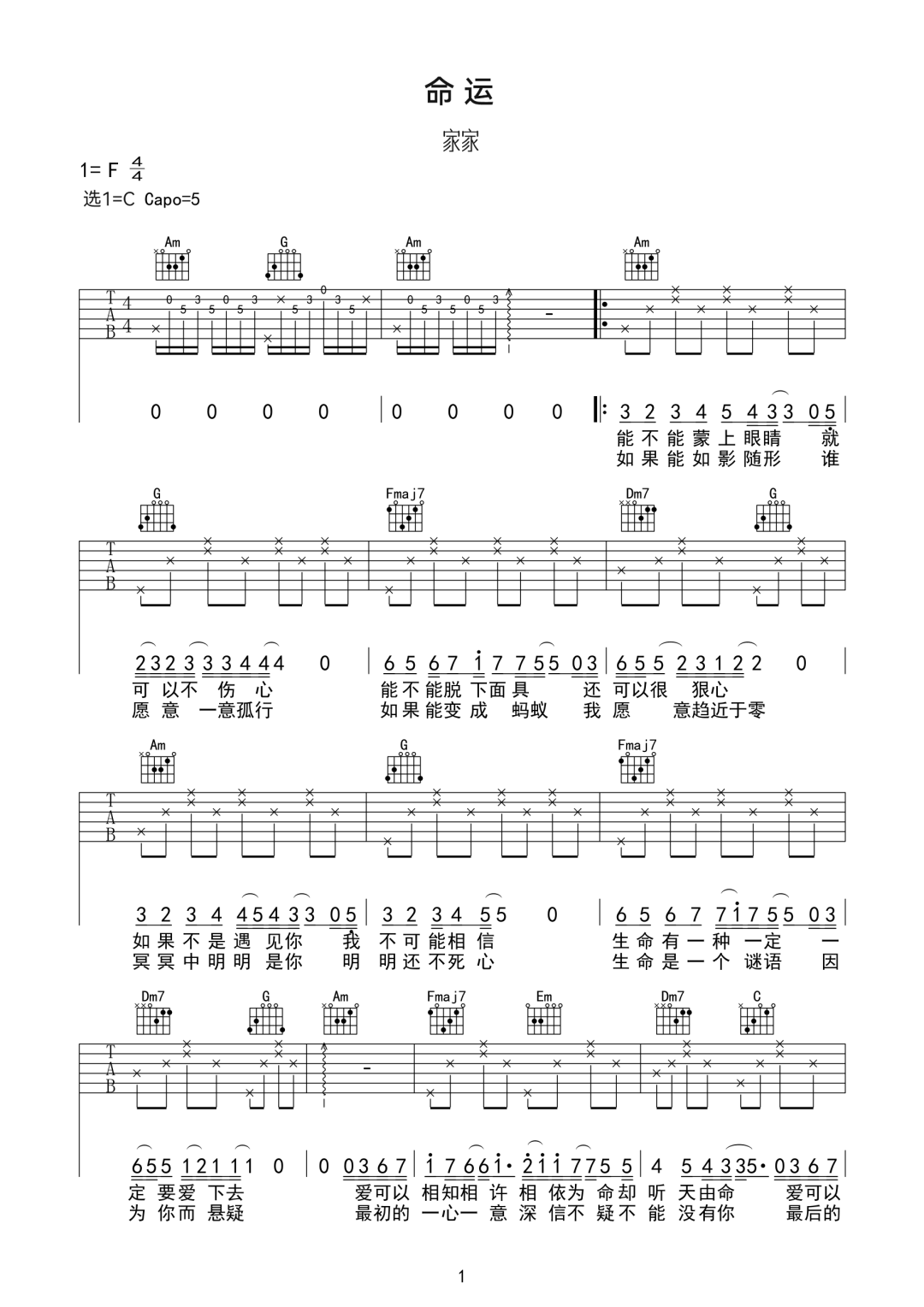 命运吉他谱 - 家家 - C调吉他弹唱谱 - 原版