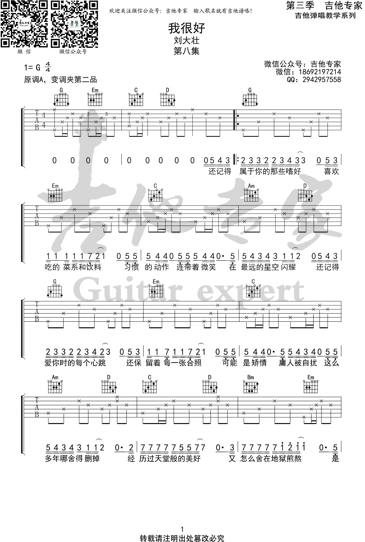 曲谱介绍: 吉他谱介绍:我很好吉他谱,刘大壮演唱的一首歌曲,4/4拍的节奏,这首歌曲的原调为A调,这里曲谱采用了G调指法进行编配,演唱时夹变调夹2品可回到原调,也可根据个人实际嗓音情况选择。曲谱由琴谱网更新上传,共3张高清图片弹唱吉他谱例,来源于@吉他专家编配出品。